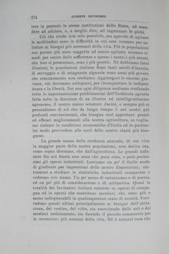 Ciò che rende non solo possibile, ma agevole di agitare le moltitudini sono le difficoltà in cui esse versano per satisfare ai bisogni più necessari della vi! a. Più le popolazioni son povere più sono soggette ad essere agitate; cercano rimedi per escire dalle sofferenze e spesso i mezzi i più strani, che loro si presentano, sono i più accetti. JSTè dobbiamo farci illusioni; le popolazioni italiane dopo tanti secoli d'inerzia, di servaggio e di sciagurate signorie souo assai più povere che comunemente non crediamo. Aggiungasi le enormi gravezze, cui dovemmo sottoporci, per riconquistare la indipendenza e la libertà. Noi con ogni diligenza andiamo studiando tutte le importantissime pubblicazioni dell'Inchiesta agraria fatta sotto la direzione di un illustre ed intelligentissimo agronomo, il nostro amico senatore Jacini, e sempre più ci persuadiamo di ciò che da lungo tempo è nei nostri più profondi convincimenti, che bisogna cioè apportare pronti ed efficaci miglioramenti alla nostra agricoltura, se vogliamo rialzare le condizioni economiche d'Italia ed in partico-lar modo provvedere alle sorti delle nostre classi più bisognose.