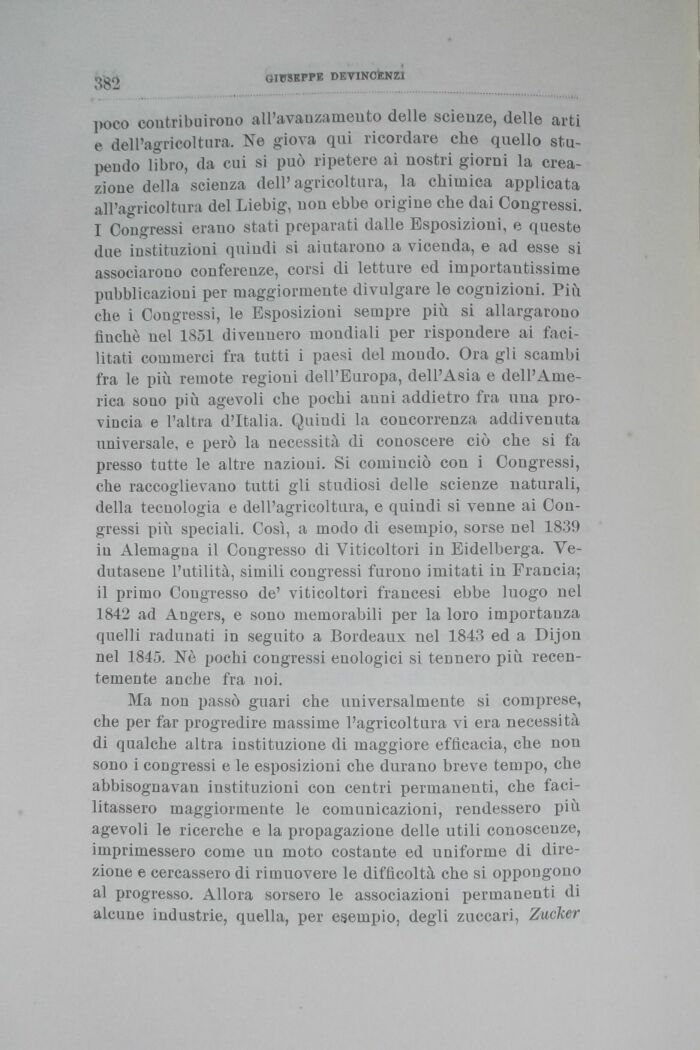 ]>oco contribuirono all'avanzamento delle scienze, delle arti e dell'agricoltura. Ne giova qui ricordare che quello stupendo libro, da cui si può ripetere ai nostri giorni la creazione della scienza dell'agricoltura, la chimica applicata all'agricoltura del Liebig, non ebbe origine che dai Congressi. I Congressi erauo stati preparati dalle Esposizioni, e queste due instituzioni quindi si aiutarono a vicenda, e ad esse si associarono conferenze, corsi di letture ed importantissime pubblicazioni per maggiormente divulgare le cognizioni. Più che i Congressi, le Esposizioni sempre più si allargarono finche nel 1851 diveuuero mondiali per rispondere ai facilitati commerci fra tutti i paesi del mondo. Ora gli scambi fra le più remote regioni dell'Europa, dell'Asia e dell'America sono più agevoli che pochi anni addietro fra una provincia e l'altra d'Italia. Quindi la concorrenza addivenuta universale, e però la necessità di conoscere ciò che si fa presso tutte le altre nazioni. Si cominciò con i Congressi, che raccoglievano tutti gli studiosi delle scienze naturali, della tecnologia e dell'agricoltura, e quindi si venne ai Congressi più speciali. Così, a modo di esempio, sorse nel 1839 in Alemagna il Congresso di Viticoltori in Eidelberga. Vedutasene l'utilità, simili congressi furono imitati in Francia; il primo Congresso de' viticoltori francesi ebbe luogo nei 1842 ad Angers, e sono memorabili per la loro importanza quelli radunati in seguito a Bordeaux nel 1843 ed a Dijon nel 1845. Nè pochi congressi enologici si tennero più recentemente anche fra noi.