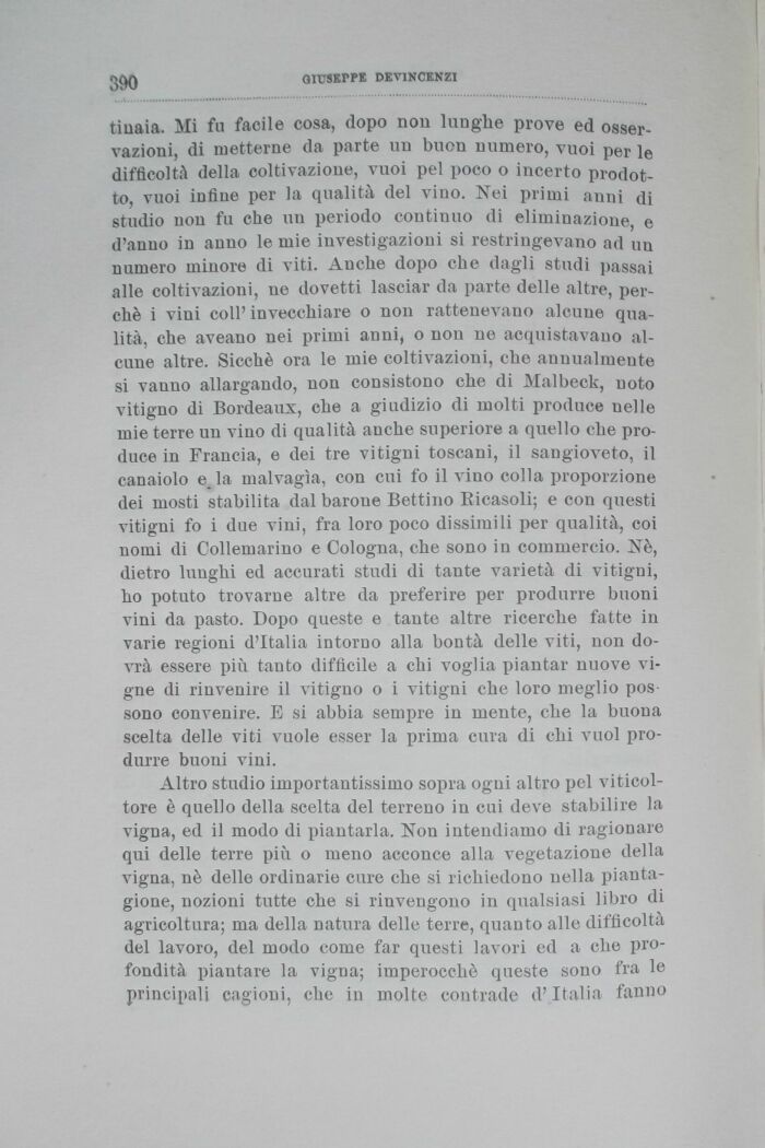 tinaia. Mi fu facile cosa, dopo non lunghe prove ed osservazioni, di metterne da parte un buon numero, vuoi per le difficoltà della coltivazione, vuoi pel poco o incerto prodotto, vuoi infine per la qualità del vino. Nei primi anni di studio non fu che un periodo continuo di eliminazione, e d'anno in anno le mie investigazioni si restringevano ad un numero minore di viti. Anche dopo che dagli studi passai alle coltivazioni, ne dovetti lasciar da parte delle altre, perchè i vini coli'invecchiare o non rattenevauo alcune qualità, che aveano nei primi anni, o non ne acquistavano alcune altre. Sicché ora le mie coltivazioni, che annualmente si vanno allargando, non consistono che di Malbeck, noto vitigno di Bordeaux, che a giudizio di molti produce nelle mie terre un vino di qualità anche superiore a quello che produce in Francia, e dei tre vitigni toscani, il sangioveto, il canaiolo e la malvagia, con cui fo il vino colla proporzione dei mosti stabilita dal barone Bettino Ricasoli; e con questi vitigni fo i due vini, fra loro poco dissimili per qualità, coi nomi di Collemarino e Cotogna, che sono in commercio. Nè, dietro lunghi ed accurati studi di tante varietà di vitigni, ho potuto trovarne altre da preferire per produrre buoni vini da pasto. Dopo queste e tante altre ricerche fatte in varie regioni d'Italia intorno alla bontà delle viti, non dovrà essere più. tanto diffìcile a chi voglia piantar nuove vigne di rinvenire il vitigno o i vitigni che loro meglio possono convenire. E si abbia sempre in mente, che la buona scelta delle viti vuole esser la prima cura di chi vuol produrre buoni vini.