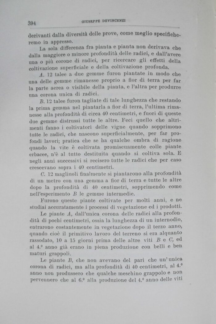 Le piante A, dall'unica corona delle radici alla profondità di pochi centimetri, ossia la lunghezza di un internodio, entrarono costantemente in vegetazione dopo il terzo anno, quando cioè il primitivo lavoro del terreno si era alquanto rassodato, 10 a 15 giorni prima delle altre viti B e C, ed al 4.° anno già erano in piena produzione con belli e ben maturi grappoli.