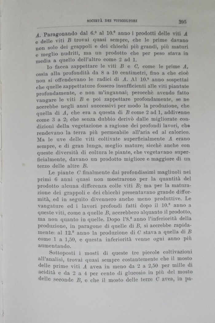 Sottoposti i mosti di queste tre piccole coltivazioni all'analisi, trovai quasi sempre costantemente che il mosto delle prime viti A avea in meno da 2 a 2,50 per mille di acidità e da 2 a 4 per cento di glucosio in più del mosto delle seconde B, e che il mosto delle terze C avea, in pa-