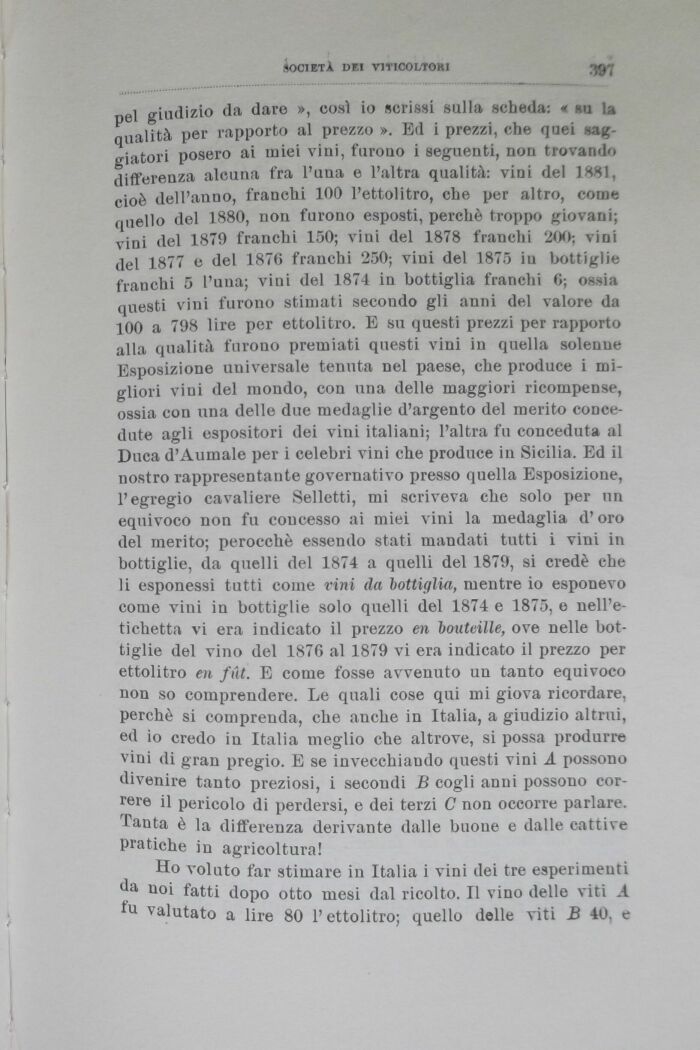 pel giudizio da dare », così io scrissi sulla scheda: « su la qualità per rapporto al prezzo ». Ed i prezzi, che quei saggiatori posero ai miei vini, furono i seguenti, non trovando differenza alcuna fra l'una e l'altra qualità: vini del 1881, cioè delTanno, franchi 100 l'ettolitro, che per altro, come quello del 1880, non furono esposti, perchè troppo giovani; vini del 1879 franchi 150; vini del 1878 franchi 200; vini del 1877 e del 1876 franchi 250; vini del 1875 iu bottiglie franchi 5 l'una; vini del 1874 in bottiglia franchi 6; ossia questi vini furono stimati secondo gli anni del valore da 100 a 798 lire per ettolitro. E su questi prezzi per rapporto alla qualità furono premiati questi vini in quella solenne Esposizione universale tenuta nel paese, che produce i migliori vini del mondo, con una delle maggiori ricompense, ossia con una delle due medaglie d'argento del merito concedute agli espositori dei vini italiani; l'altra fu conceduta al Duca d'Aumale per i celebri vini che produce in Sicilia. Ed il nostro rappresentante governativo presso quella Esposizione, l'egregio cavaliere Selletti, mi scriveva che solo per un equivoco non fu concesso ai miei vini la medaglia d'oro del merito; perocché essendo stati mandati tutti i vini in bottiglie, da quelli del 1874 a quelli del 1879, si credè che li esponessi tutti come vini da bottiglia, mentre io esponevo come vini in bottiglie solo quelli del 1874 e 1875, e nell'etichetta vi era indicato il prezzo en boutville, ove nelle bottiglie del vino del 1876 al 1879 vi era indicato il prezzo per ettolitro en flit. E come fosse avvenuto un tanto equivoco non so comprendere. Le quali cose qui mi giova ricordare, perchè si comprenda, che anche in Italia, a giudizio altrui, ed io credo in Italia meglio che altrove, si possa produrre vini di gran pregio. E se invecchiando questi vini A possono divenire tanto preziosi, i secondi B cogli anni possono correre il pericolo di perdersi, e dei terzi C non occorre parlare. Tanta è la differenza derivante dalle buone e dalle cattive Pratiche in agricoltura!
