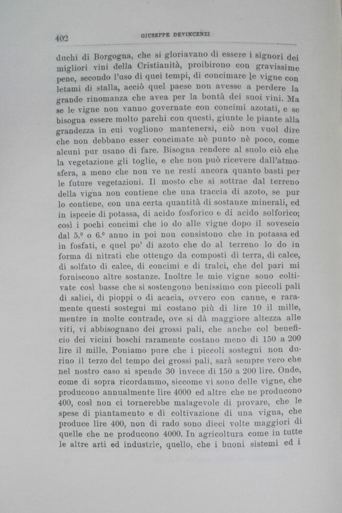 duchi di Borgogna, che si gloriavano di essere i signori dei migliori vini delia Cristianità, proibirono con gravissime pene, secondo Fuso di quei tempi, di concimare le vigne con letami di stalla, acciò quel paese non avesse a perdere la grande rinomanza che avea per la bontà dei suoi vini. Ma se le vigne non vanno governate con concimi azotati, e se bisogna essere molto parchi con questi, giunte le piante alla grandezza in cui vogliono mantenersi, ciò non vuol dire che non debbano esser concimate nè punto nè poco, come alcuni pur usano di fare. Bisogna rendere al suolo ciò che la vegetazione gli toglie, e che non può ricevere dall'atmosfera, a meno che non ve ne resti ancora quanto basti per le future vegetazioni. Il mosto che si sottrae dal terreno della vigna non contiene che una traccia di azoto, se pur lo contiene, con una certa quantità di sostanze minerali, ed in ispecie di potassa, di acido fosforico e di acido solforico; così i pochi concimi che io do alle vigne dopo il sovescio dal 5.° o 6.° anno in poi non consistono che in potassa ed in fosfati, e quel pò7 di azoto che do al terreno lo do in forma di nitrati che ottengo da composti di terra, di calce, di solfato di calce, di concimi e di tralci, che del pari mi forniscono altre sostanze. Inoltre le mie vigne sono coltivate così basse che si sostengono benissimo con piccoli pali di salici, di pioppi o di acacia, ovvero con canne, e raramente questi sostegni mi costano più di lire 10 il mille, mentre in molte contrade, ove si dà maggiore altezza alle viti, vi abbisognano dei grossi pali, che anche col benefìcio dei vicini boschi raramente costano meno di 150 a 200 lire il mille. Poniamo pure che i piccoli sostegni non durino il terzo del tempo dei grossi pali, sarà sempre vero che nel nostro caso si spende 30 invece di 150 a 200 lire. Onde, come di sopra ricordammo, siccome vi sono delle vigne, che producono annualmente lire 4000 ed altre che ne producono 400, così non ci tornerebbe malagevole di provare, che le spese di piantamento e di coltivazione di una vigna, che produce lire 400, non di rado sono dieci volte maggiori di quelle che ne producono 4000. In agricoltura come in tutte le altre arti ed industrie, quello, che i buoni sistemi ed i