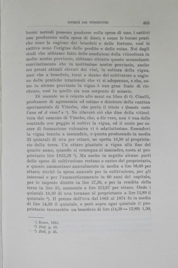 Di recente ne è venuto alle mani un libro di O. Cinelli, I>rofessore di agronomia ed estimo e direttore della cantina sperimentale di Viterbo, che porta il titolo « Quanto costa l'uva ed il vino?» 1). Ne rileverò ciò che dice della viticoltura del comune di Viterbo, che, a dir vero, non è una delle contrade ove peggio si coltivi la vigna, ed il suolo per essere di formazione vulcanica vi è adattatissimo. Essendovi la vigna tenuta a mezzadria, e questa producendo in media 33 quintali di uva per ettaro, ne spetta 16,50 al proprietario della terra. Un ettaro piantato a vigna alla fine del quarto anno, quando si consegna al mezzadro, costa al proprietario lire 1823,58 2). Ma anche in seguito alcune parti delle spese di coltivazione restano a carico del proprietario, e queste ammontano annualmente in media a lire 98,60 per ettaro; sicché la spesa annuale per la coltivazione, per gli interessi e per l'ammortizzamento in 60 anni del capitale, per le imposte dirette in lire 27,36, e per la rendita della terra in lire 35, ammonta a lire 212,67 per ettaro. Onde i quintali 16,50 di uva tornano al proprietario a lire 12,89 il quintale 3). Il prezzo dell'uva dal 1865 al 1874 fu in media di lire 14,39 il quintale, e però sopra ogni quintale il proprietario troverebbe un benefìcio di lire (14,39 12,89) 1,50,