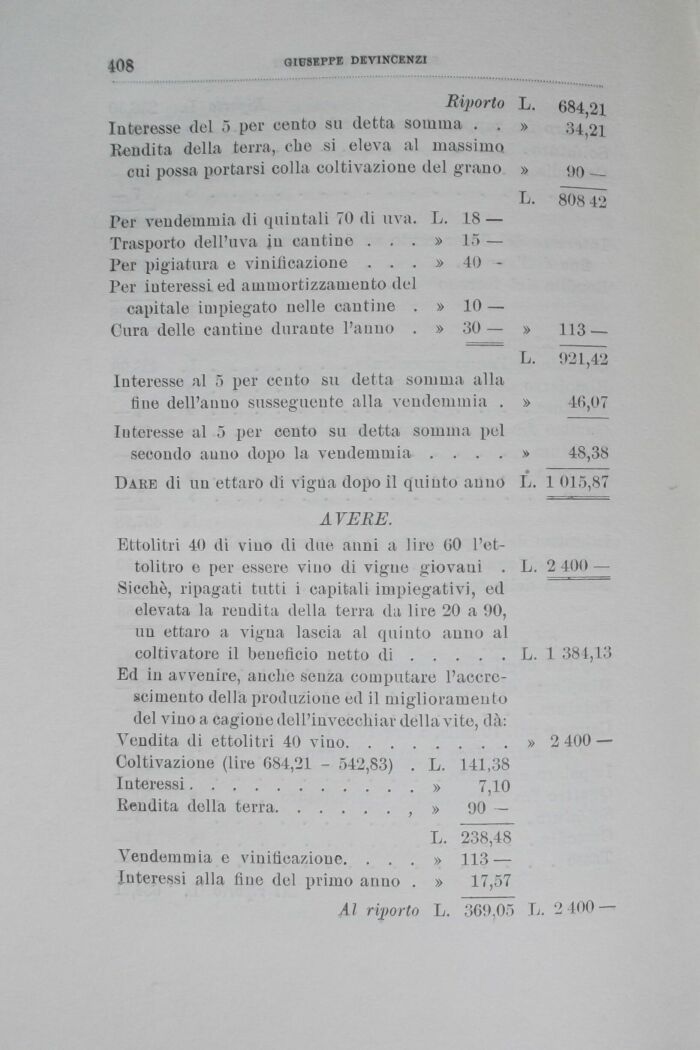 Ettolitri 40 di vino di due anni a lire 60 l'ettolitro e per essere vino di vigne giovaui . L. 2 400 Sicché, ripagati tutti i capitali impiegativi, ed elevata la rendita della terra da lire 20 a 90, un ettaro a vigna lascia al quinto anno al