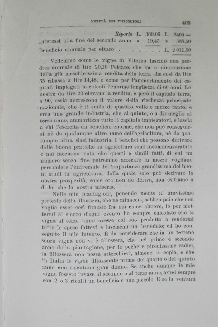 Vedemmo come le vigne in Viterbo lascino una perdita annuale di lire 20,16 l'ettaro, cbe va a diminuzione della già meschinissima rendita della terra, cbe cosi da lire 35 ribassa a lire 14,48, e come per l'ammortamento dei capitali impiegati si calcoli l'enorme lunghezza di 60 anni. Le nostre da lire 20 elevano la rendita, e però il capitale terra, a 90, ossia accrescono il valore della ricchezza principale nazionale, che è il suolo di quattro volte e mezzo tanto, e crea una grande industria, che al quinto, o a dir meglio al terzo anno, ammortizza tutto il capitale impiegatovi, e lascia a chi l'esercita un beneficio enorme, che non può conseguirsi nè da qualunque altro ramo dell'agricoltura, nè da qualunque altra siasi industria. I benefici che possono derivare dalle buone pratiche in agricoltura sono incommensurabili; e noi facciamo voto che questi e simili fatti, di cui un numero senza fine potremmo arrecare in mezzo, vogliano persuadere l'universale dell'importanza grandissima dei buoni studi iu agricoltura, dalla quale solo può derivare la nostra prosperità, come ora non ne deriva, non esitiamo a dirlo, che la nostra miseria.