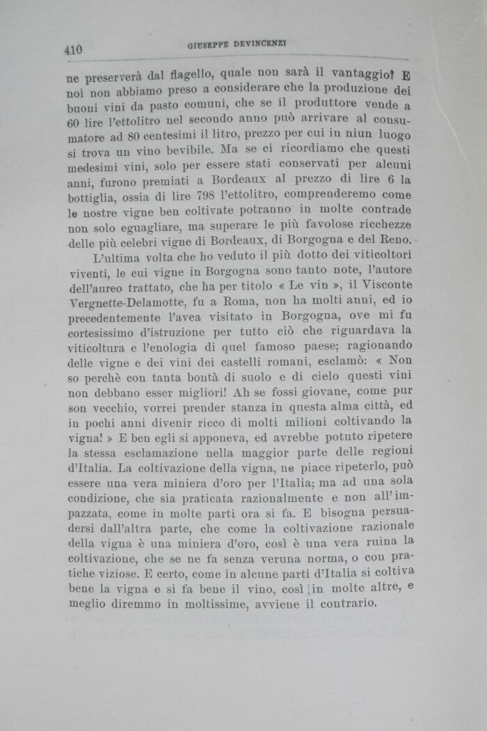 ne preserverà dal flagello, quale non sarà il vantaggio? E noi non abbiamo preso a considerare che la produzione dei buoni vini da pasto comuni, che se il produttore vende a 60 lire l'ettolitro nel secondo anno può arrivare al consumatore ad 80 centesimi il litro, prezzo per cui in niun luogo si trova un vino bevibile. Ma se ci ricordiamo che questi medesimi vini, solo per essere stati conservati per alcuni anni, furono premiati a Bordeaux al prezzo di lire 6 la bottiglia, ossia di lire 798 l'ettolitro, comprenderemo come le nostre vigne ben coltivate potranno in molte contrade non solo eguagliare, ma superare le più favolose ricchezze delle più celebri vigne di Bordeaux, di Borgogna e del Reno.
