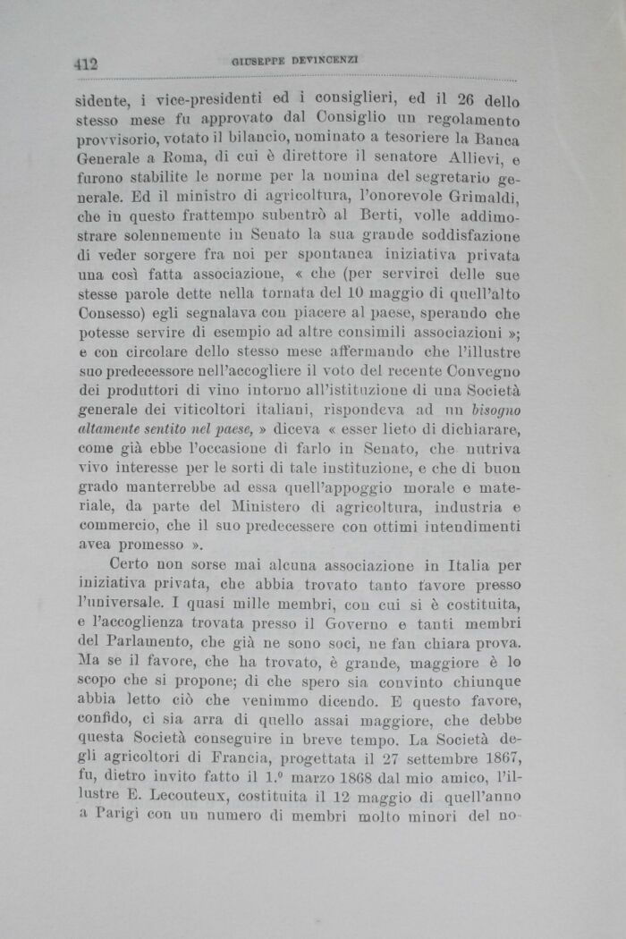 sidente, i vice-presidenti ed i consiglieri, ed il 26 dello stesso mese fu approvato dal Consiglio un regolamento provvisorio, votato il bilaucio, nominato a tesoriere la Banca Generale a Koina, di cui è direttore il senatore Allievi, e furono stabilite le norme per la nomina del segretario generale. Ed il ministro di agricoltura, l'onorevole Grimaldi, che in questo frattempo subentrò al Berti, volle addimostrare solennemente in Seuato la sua grande soddisfazione di veder sorgere fra noi per spontanea iniziativa privata una così fatta associazione, « che (per servirci delle sue stesse parole dette nella tornata del 10 maggio di quell'alto Consesso) egli segnalava con piacere al paese, speraudo che potesse servire di esempio ad altre consimili associazioni »; e con circolare dello stesso mese affermando che l'illustre suo predecessore nel l'accogliere il voto del recente Convegno dei produttori di vino intorno all'istituzione (li una Società generale dei viticoltori italiani, rispondeva ad un bisogno altamente sentito nel paese, » diceva « esser lieto di dichiarare, come già ebbe l'occasione di farlo in Senato, che nutriva vivo interesse per le sorti di tale instituzione, e che di buon grado manterrebbe ad essa quell'appoggio morale e materiale, da parte del Ministero di agricoltura, industria e commercio, che il suo predecessere con ottimi intendimenti avea promesso ».