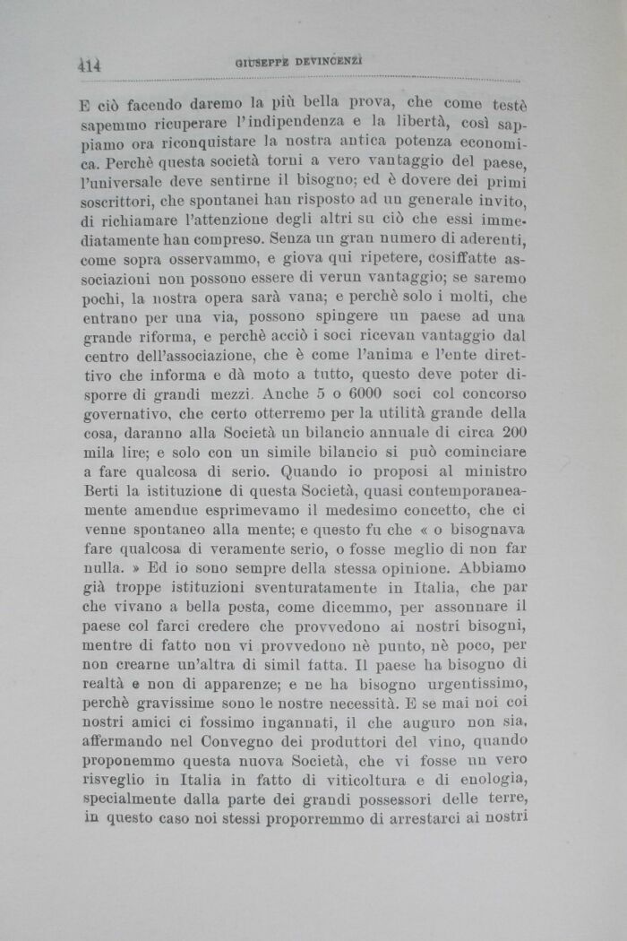 E ciò faceudo daremo la più bella prova, che come testò sapemmo ricuperare Vindipendenza e la libertà, così sappiamo ora riconquistare la nostra antica potenza economica, Perchè questa società torni a vero vantaggio del paese, l'universale deve sentirne il bisogno; ed è dovere dei primi soscrittori, che spontanei han risposto ad un generale invito, di richiamare l'attenzione degli altri su ciò che essi immediatamente han compreso. Senza un gran numero di aderenti, come sopra osservammo, e giova qui ripetere, cosiffatte associazioni non possono essere di verun vantaggio; se saremo pochi, la nostra opera sarà vana; e perchè solo i molti, che entrano per una via, possono spingere un paese ad una grande riforma, e perchè acciò i soci ricevan vantaggio dal centro dell'associazione, che è come l'anima e l'ente direttivo che informa e dà moto a tutto, questo deve poter disporre di grandi mezzi. Anche 5 o 6000 soci col concorso governativo, che certo otterremo per la utilità grande della cosa, daranno alla Società un bilancio annuale di circa 200 mila lire; e solo con un simile bilancio si può cominciare a fare qualcosa di serio. Quando io proposi al ministro Berti la istituzione di questa Società, quasi contemporaneamente amendue esprimevamo il medesimo concetto, che ci venne spontaneo alla mente; e questo fu che « o bisognava fare qualcosa di veramente serio, o fosse meglio di non far nulla. » Ed io sono sempre della stessa opinione. Abbiamo già troppe istituzioni sventuratamente in Italia, che par che vivano a bella posta, come dicemmo, per assonnare il paese col farci credere che provvedono ai nostri bisogni, mentre di fatto non vi provvedono nè punto, nè poco, per non crearne un'altra di simil fatta. Il paese ha bisogno di realtà e non di apparenze; e ne ha bisogno urgentissimo, perchè gravissime sono le nostre necessità. E se mai noi coi nostri amici ci fossimo ingannati, il che auguro non sia, affermando nel Convegno dei produttori del vino, quando proponemmo questa nuova Società, che vi fosse un vero risveglio in Italia in fatto di viticoltura e di enologia, specialmente dalla parte dei grandi possessori delle terre, in questo caso noi stessi proporremmo di arrestarci ai nostri