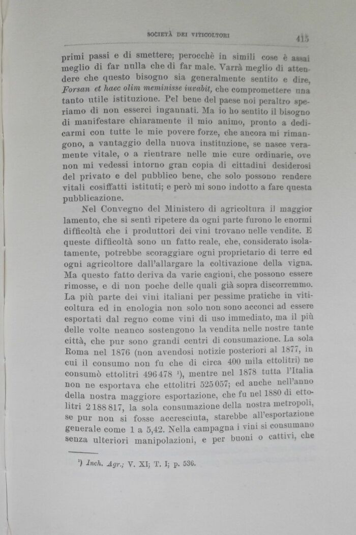 Nel Convegno del Ministero di agricoltura il maggior lamento, che si sentì ripetere da ogni parte furono le enormi difficoltà che i produttori dei vini trovano nelle vendite. E queste difficoltà sono un fatto reale, che, considerato isolatamente, potrebbe scoraggiare ogni proprietario di terre ed ogni agricoltore dall'allargare la coltivazione della vigna. Ma questo fatto deriva da varie cagioni, che possono essere rimosse, e di non poche delle quali già sopra discorremmo. La più parte dei vini italiani per pessime pratiche in viticoltura ed in enologia non solo non sono acconci ad essere esportati dal regno come vini di uso immediato, ma il più delle volte neanco sostengono la vendita nelle nostre tante città, che pur sono grandi centri di consumazione. La sola Roma nel 1876 (non avendosi notizie posteriori al 1877, in cui il consumo non fu che di circa 400 mila ettolitri) ne consumò ettolitri 496478 >), mentre nel 1878 tutta l'Italia non ne esportava che ettolitri 525 057; ed anche nell'anno della nostra maggiore esportazione, che fu nel 1880 di ettolitri 2188 817, la sola consumazione della nostra metropoli, se pur non si fosse accresciuta, starebbe all'esportazione generale come 1 a 5,42. Nella campagna i vini si consumano senza ulteriori manipolazioni, e per buoni o cattivi, che