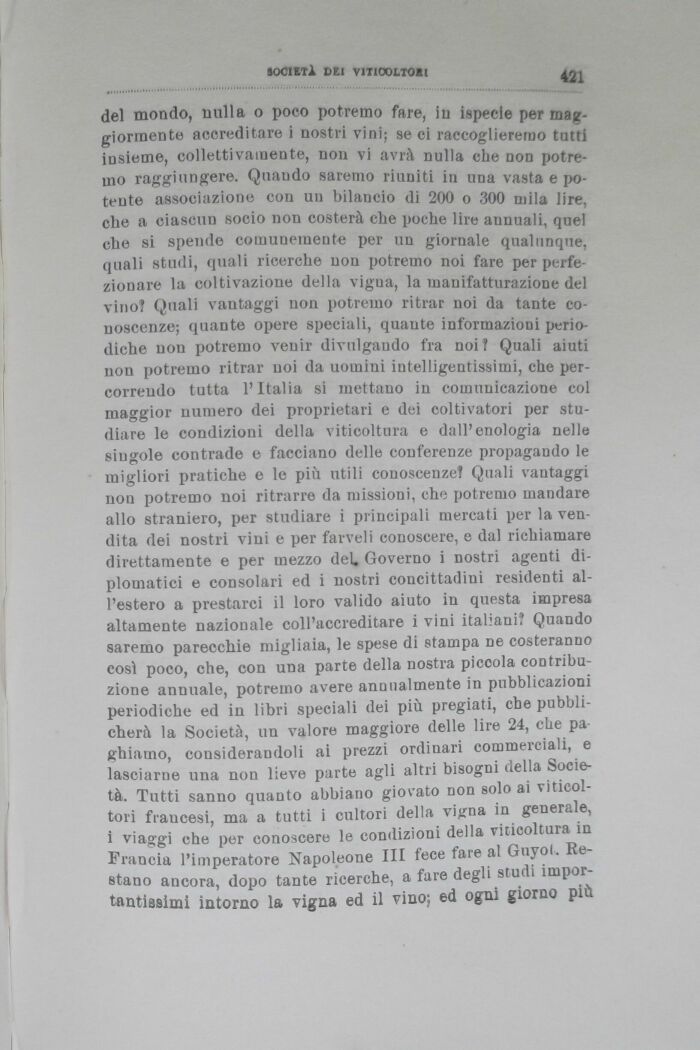 del mondo, nulla o poco potremo fare, in ispecie per maggiormente accreditare i nostri vini; se ci raccoglieremo tutti insieme, collettivamente, nou vi avrà nulla che non potremo raggiungere. Quando saremo riuniti in una vasta e potente associazione con un bilancio di 200 o 300 mila lire, che a ciascun socio non costerà che poche lire annuali, quel che si spende comunemente per un giornale qualunque, quali studi, quali ricerche non potremo noi fare per perfezionare la coltivazione della vigna, la mauifatturazione del vino! Quali vantaggi non potremo ritrar noi da tante conoscenze; quante opere speciali, quante informazioni periodiche non potremo venir divulgando fra noi? Quali aiuti non potremo ritrar noi da uomini intelligentissimi, che percorrendo tutta l'Italia si mettano in comunicazione col maggior numero dei proprietari e dei coltivatori per studiare le condizioni della viticoltura e dall'enologia nelle singole contrade e facciano delle conferenze propagando le migliori pratiche e le più utili conoscenze? Quali vantaggi non potremo noi ritrarre da missioni, che potremo mandare allo straniero, per studiare i principali mercati per la vendita dei nostri vini e per farveli conoscere, e dal richiamare direttamente e per mezzo deL Governo i nostri agenti diplomatici e consolari ed i nostri concittadini residenti all'estero a prestarci il loro valido aiuto in questa impresa altamente nazionale coll'accreditare i vini italiani? Quando saremo parecchie migliaia, le spese di stampa ne costeranno così poco, che, con una parte della nostra piccola contribuzione annuale, potremo avere annualmente in pubblicazioni periodiche ed in libri speciali dei più pregiati, che pubblicherà la Società, un valore maggiore delle lire 24, che paghiamo, considerandoli ai prezzi ordinari commerciali, e lasciarne una non lieve parte agli altri bisogni della Società. Tutti sanno quanto abbiano giovato non solo ai viticoltori francesi, ma a tutti i cultori della vigna in generale, i viaggi che per conoscere le condizioni della viticoltura in Francia l'imperatore Napoleone III fece fare al Guyoi. Restano ancora, dopo tante ricerche, a fare degli studi importantissimi intorno la vigna ed il vino; ed ogni giorno più