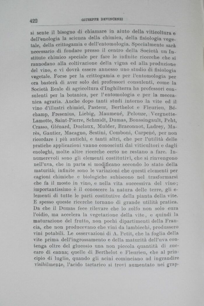 si sente il bisogno di chiamare in aiuto della viticoltura e dell'enologia la scienza della chimica, della fisiologia vegetale, della crittogamia e dell'entomologia. Specialmente sarà necessario di fondare presso il centro della Società un In-stituto chimico speciale per fare le infinite ricerche che si rannodano alla coltivazione della vigna ed alla produzione del vino, e vi dovrà essere annesso uno studio di fisiologia vegetale. Forse per la crittogamia e per l'entomologia per ora basterà di aver solo dei professori consulenti, come la Società Reale di agricoltura d'Inghilterra ha professori consulenti per la botanica, per l'entomologia e per la meccanica agraria. Anche dopo tanti studi intorno la vite ed il vino d'illustri chimici, Pasteur, Berthelot e Fleurieu, Bé-champ, Fresenius, Liebig, Maumené, Pelouze, Vergnette-Lamotte, Saint-Pierre, Schmidt, Dumas, Bonssingault, Peht, Crasso, Glénard, Duclaux, Mulder, Braconnot, Ladrey, Ma-rès, Gautier, Macagno, Sestini, Comboni, Carpené, per non ricordare i più antichi, e tanti altri, che per l'utilità delle pratiche applicazioni vanno conosciuti dai viticultari e dagli enologhi, molte altre ricerche certo ne restano a fare, Innumerevoli sono gli elementi costitutivi, che si rinvengono nell'uva, che in parte si modificano secondo lo stato della maturità; infinite sono le variazioni che questi elementi per cagioni chimiche e biologiche subiscono nel trasformarsi che fa il mosto in vino, e nella vita successiva del vino; importantissimo è il conoscere la natura delle terre, gli e-lexnenti di tutte le parti costitutive della pianta della vite. E spesso queste ricerche tornano di grande utilità pratica. Da che il Dumas fece rilevare che lo zolfo non solo cura l'oidio, ma accelera la vegetazione della vite, e quindi la maturazione del frutto, non pochi dipartimenti della Francia, che non producevano che vini da lambicchi, produssero vini potabili. Le osservazioni di A. Petit, che la foglia della vite prima dell'ingrossamento e della maturità dell'uva contenga oltre del glucosio una non piccola quantità di zuc-caro di canna; quelle di Berthelot e Fleurieu, che al principio di luglio, quando gli acini cominciano ad ingrandire visibilmente, l'acido tartarico si trovi aumentato nei grap-
