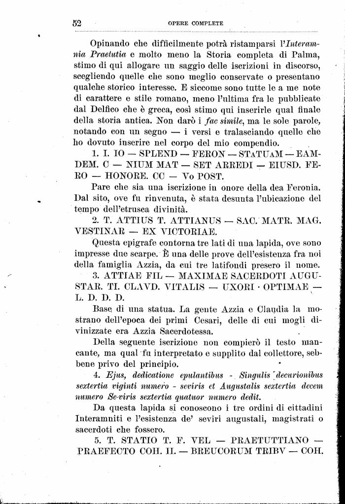 Opinando che difficilmente potrà ristamparsi VInteram-nia Praeiutia e molto meno la Storia completa di Palma, stimo di qui allogare un saggio delle iscrizioni in discorso, scegliendo quelle che sono meglio conservate o presentano qualche storico interesse. E siccome sono tutte le a me note di carattere e stile romano, meno l'ultima fra le pubblicate dal Delfico che è greca, così stimo qui inserirle qual finale della storia antica. Non darò i fac simile, ma le sole parole, notando con un segno — i versi e tralasciando quelle che ho dovuto inserire nel corpo del mio compendio.