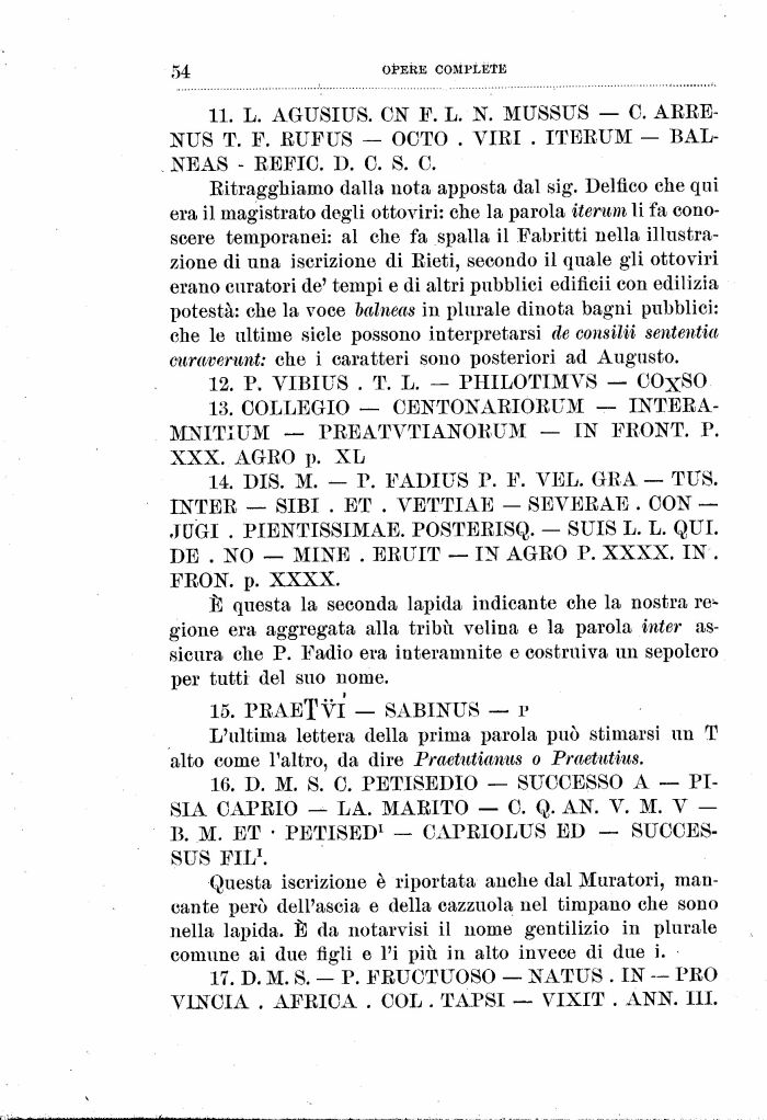 Bitragghiamo dalla nota apposta dal sig. Delfico che qui era il magistrato degli ottoviri: che la parola iterum li fa conoscere temporanei: al che fa spalla il Fabritti nella illustrazione di una iscrizione di Eieti, secondo il quale gli ottoviri erano curatori de' tempi e di altri pubblici edificii con edilizia potestà: che la voce balneas in plurale dinota bagni pubblici: che le ultime sicle possono interpretarsi de consilii sententia curaverunt: che i caratteri sono posteriori ad Augusto.