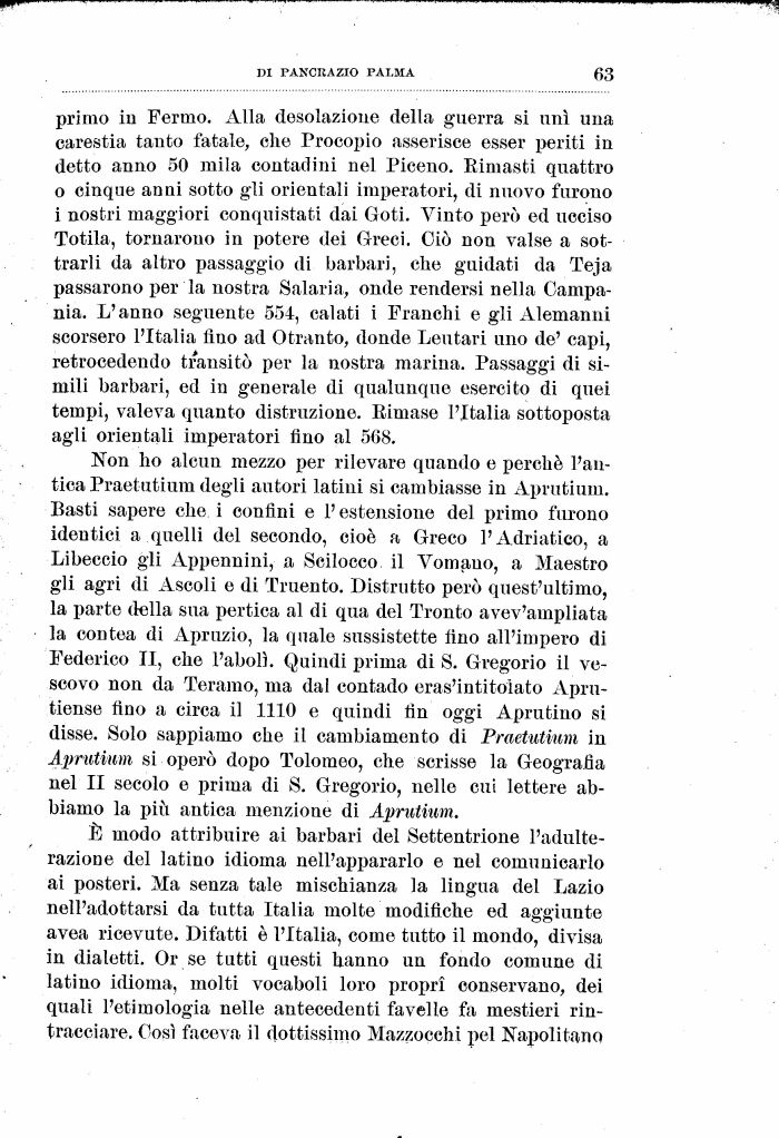 Non ho alcun mezzo per rilevare quando e perché l'antica Praetutium degli autori latini si cambiasse in Aprutium. Basti sapere che i confini e l'estensione del primo furono identici a quelli del secondo, cioè a Greco l'Adriatico, a Libeccio gli Appennini, a Scilocco il Vernano, a Maestro gli agri di Ascoli e di Truento. Distrutto però quest'ultimo, la parte della sua pertica al di qua del Trento avev'ampliata la contea di Apruzio, la quale sussistette fino all'impero di Federico II, che l'abolì. Quindi prima di S. Gregorio il vescovo non da Teramo, ma dal contado eras'intitoiato Apru-tiense fino a circa il 1110 e quindi fin oggi Aprutino si disse. Solo sappiamo che il cambiamento di Praetutium in Aprutium si operò dopo Tolomeo, che scrisse la Geografia nel II secolo e prima di S. Gregorio, nelle cui lettere abbiamo la più antica menzione di Aprutium.