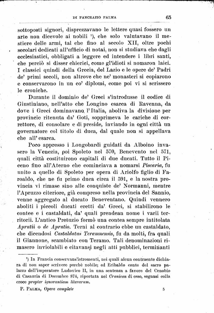 Poco appresso i Longobardi guidati da Alboino invasero la Venezia, poi Spoleto nel 570, Benevento nel 571, quali città costituirono capitali di due ducati. Tutto il Piceno fino ali'Aterno che cominciava a nomarsi Piscaria, fu unito a quello di Spoleto per opera di Ariolfo figlio di Fa-roaldo, che ne fu primo duca circa il 591, e la nostra provincia vi rimase sino alle conquiste de' Normanni, mentre l'Apruzzo citeriore, già compreso nella provincia del Sannio, venne aggregato al ducato Beneventano. Quindi vennero aboliti i piccoli ducati eretti da' Greci, si stabilirono le contee e i castaldati, da' quali prendean nome i varii territorii. L'antico Pretuzio formò una contea sempre intitolata Aprutii o de Aprutiq. Terni al contrario ebbe un castaldato, che dicendosi Castaldatutt Teramnensis, fu da molti, fra quali il Giannone, scambiato con Teramo. Tali denominazioni rimasero inviolabili e citavansi negli atti pubblici, terminanti