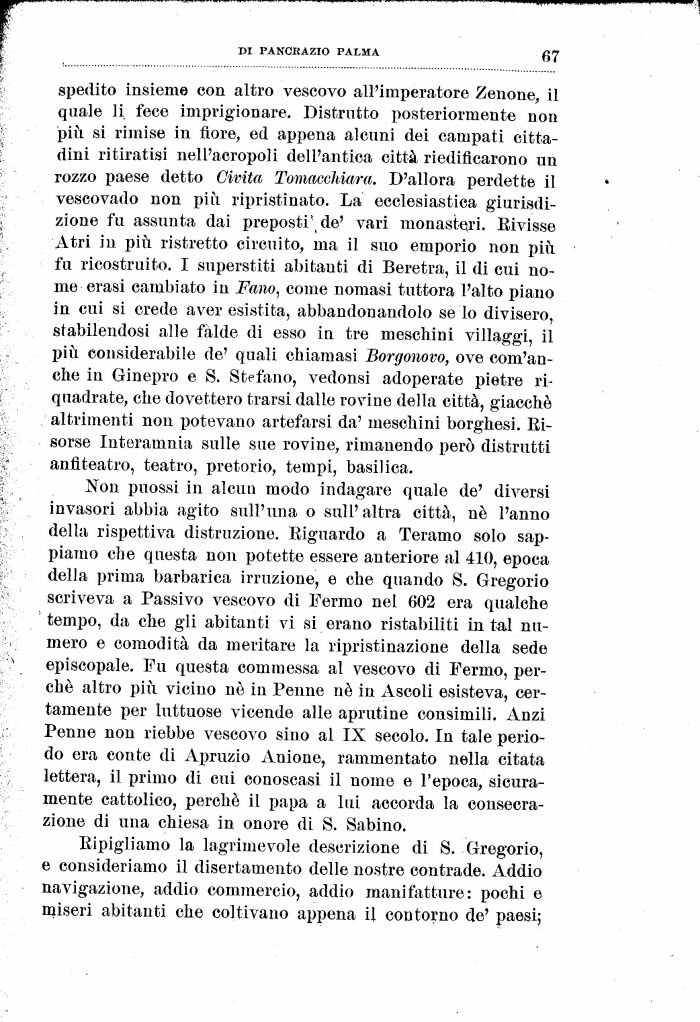 Non puossi in alcun modo indagare quale de' diversi invasori abbia agito sull'una o sull'altra città, né l'anno della rispettiva distruzione. Riguardo a Teramo solo sappiamo che questa non potette essere anteriore al 410, epoca della prima barbarica irruzione, e che quando S. Gregorio scriveva a Passivo vescovo di Fermo nel 602 era qualche tempo, da che gli abitanti vi si erano ristabiliti in tal numero e comodità da meritare la ripristinazione della sede episcopale. Fu questa commessa al vescovo di Fermo, perché altro più vicino né in Penne né in Ascoli esisteva, certamente per luttuose vicende alle aprutine consimili. Anzi Penne non riebbe vescovo sino al IX secolo. In tale periodo era eonte di Apruzio Anione, rammentato nella citata lettera, il primo di cui conoscasi il nome e l'epoca, sicuramente cattolico, perché il papa a lui accorda la consecra-zione di una chiesa in onore di S. Sabino.