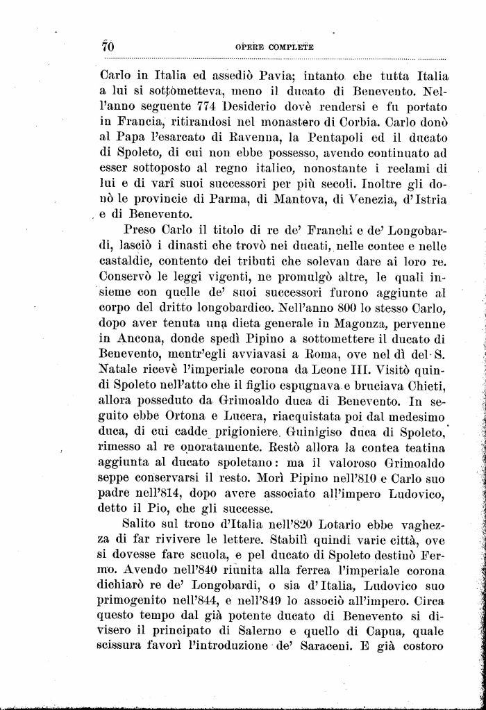 Preso Carlo il titolo di re de' Franchi e de' Longobardi, lasciò i dinasti che trovò nei ducati, nelle contee e nelle castaldie, contento dei tributi che solevan dare ai loro re. Conservò le leggi vigenti, ne promulgò altre, le quali insieme con quelle de' suoi successori furono aggiunte al corpo del dritto longobardico. Nell'anno 800 lo stesso Carlo, dopo aver tenuta una dieta generale in Magonza, pervenne in Ancona, donde spedì Pipino a sottomettere il ducato di Benevento, mentr'egii avviavasi a Eoma, ove nel dì del S. Natale ricevè l'imperiale corona da Leone III. Visitò quindi Spoleto nell'atto che il figlio espugnava e bruciava Chieti, allora posseduto da Grimoaldo duca di Benevento. In seguito ebbe Ortona e Lucera, riacquistata poi dal medesimo duca, di cui cadde prigioniere. Guinigiso duca di Spoleto, rimesso al re onoratamente. Eestò allora la contea teatina aggiunta al ducato spoletano : ma il valoroso Grimoaldo seppe conservarsi il resto. Morì Pipino nell'810 e Carlo suo padre nell'814, dopo avere associato all'impero Ludovico, detto il Pio, che gli successe.