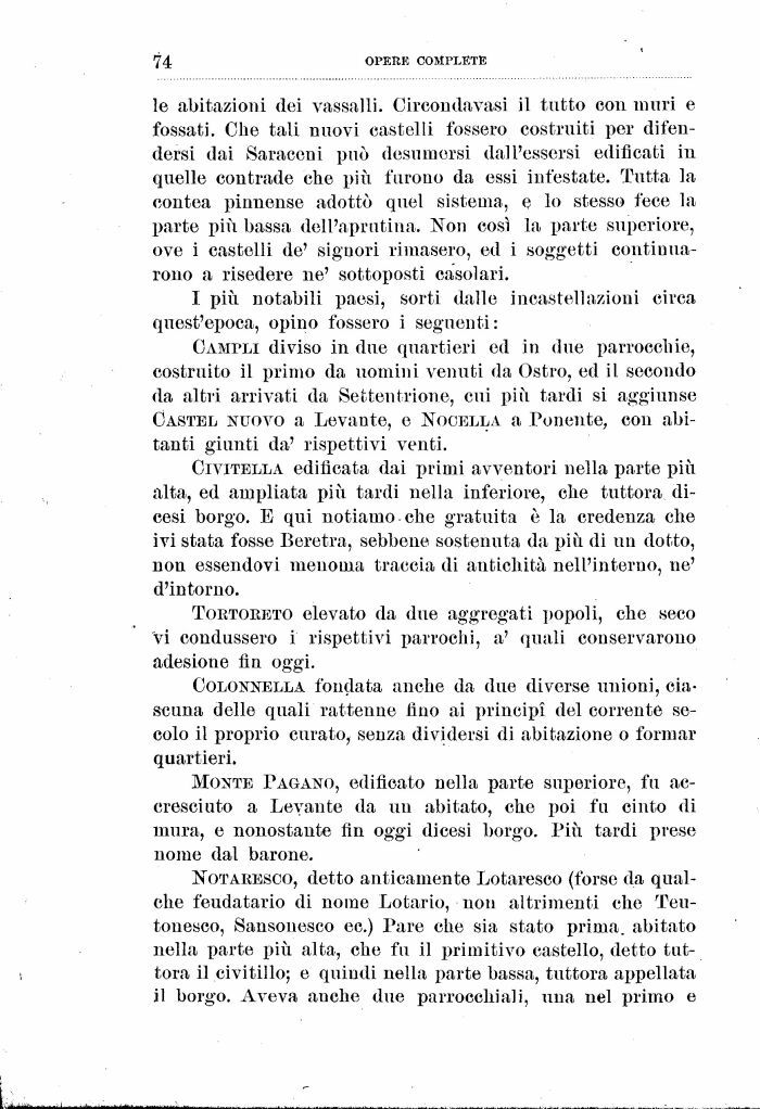 CAMPLI diviso in due quartieri ed in due parrocchie, costruito il primo da uomini venuti da Ostro, ed il secondo da altri arrivati da Settentrione, cui più tardi si aggiunse CASTEL nuovo a Levante, e NOCELLA a Ponente, con abitanti giunti da' rispettivi venti.