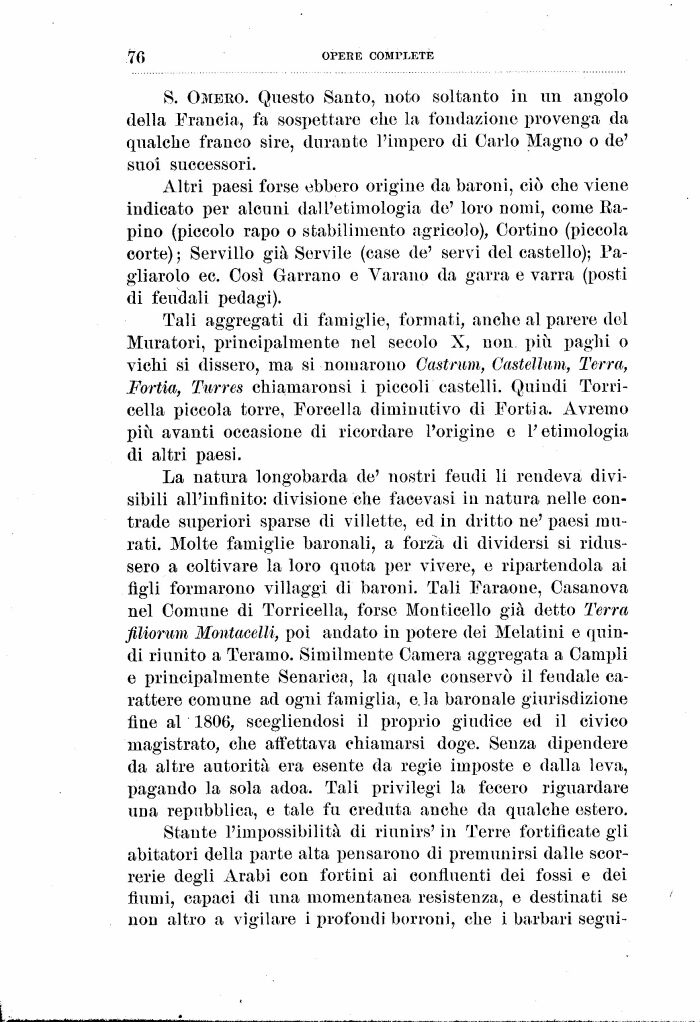 La natura longobarda de' nostri feudi li rendeva divisibili all'infinito: divisione che facevasi ili natura nelle contrade superiori sparse di villette, ed in dritto ne' paesi murati. Molte famiglie baronali, a forza di dividersi si ridussero a coltivare la loro quota per vivere, e ripartendola ai figli formarono villaggi di baroni. Tali Faraone, Casanova nel Comune di Torricella, forse Monticello già detto Terra filiorum Montacelli, poi andato in potere dei Melatila e quindi riunito a Teramo. Slmilmente Camera aggregata a Campii e principalmente Senarica, la quale conservò il feudale carattere comune ad ogni famiglia, e.la baronale giurisdizione fine al 1806, scegliendosi il proprio giudice ed il civico magistrato, che affettava chiamarsi doge. Senza dipendere da altre autorità era esente da regie imposte e dalla leva, pagando la sola adoa. Tali privilegi la fecero riguardare una repubblica, e tale fu creduta anche da qualche estero.