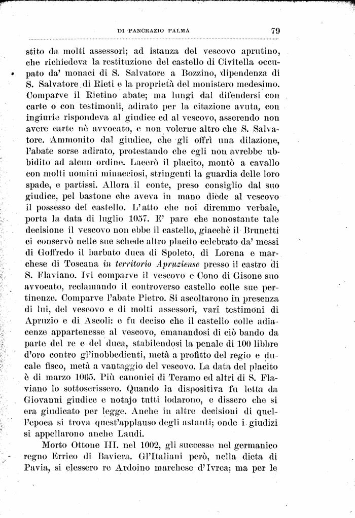 stito da molti assessori; ad istanza del vescovo aprutino, che richiedeva la restituzione del castello di Civitella occupato da' monaci di S. Salvatore a Cozzino, dipendenza di S. Salvatore di Eieti e la proprietà del monistero medesimo. Comparve il Itietiuo abate; ma lungi dal difendersi con carte o con testimonii, adirato per la citazione avuta, con ingiurio rispondeva al giudice ed al vescovo, asserendo non avere carte né avvocato, e non volerne altro che S. Salvatore. Ammonito dal giudice, che gli offrì una dilazione, l'abate sorse adirato, protestando che egli non avrebbe ubbidito ad alcun ordine. Lacerò il placito, montò a cavallo con molti uomini minacciosi, stringenti la guardia delle loro spade, e partissi. Allora il conte, preso consiglio dal suo giudice, pel bastone che aveva in mano diede al vescovo il possesso del castello. L'atto che noi diremmo verbale, porta la data di luglio 1057. E' pare che nonostante tale decisione il vescovo non ebbe il castello, giacché il Brunetti ci conservò nelle sue schede altro placito celebrato da' messi di Goffredo il barbato duca di Spoleto, di Lorena e marchese di Toscana in territorio Apruziense presso il castro di S. Flaviano. Ivi comparve il vescovo e Cono di Gisone suo avvocato, reclamando il controverso castello colle sue pertinenze. Comparve l'abate Pietro. Si ascoltarono in presenza di lui, del vescovo e di molti assessori, vari testimoni di Apruzio e di Ascoli: e fu deciso che il castello colle adiacenze appartenesse al vescovo, emanandosi di ciò bando da parte del re e del duca, stabilendosi la penale di 100 libbre d'oro contro gl'inobbedienti, metà a profitto del regio e ducale fisco, metà a vantaggio del vescovo. La data del placito è di marzo 1005. Più canonici di Teramo ed altri di S. Flaviano lo sottoscrissero. Quando la dispositiva fu letta da Giovanni giudice e notajo tutti lodarono, e dissero che si era giudicato per legge. Anche iu altro decisioni di quell'epoca si trova quest'applauso degli astanti; onde i giudizi si appellarono anche Laudi.