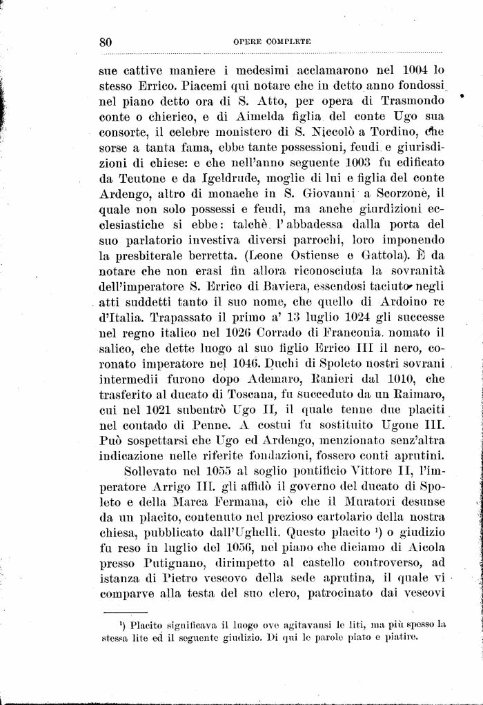 sue cattive maniere i medesimi acclamarono nel 1004 lo stesso Errico. Piacemi qui notare che in detto anno fondessi nel piano detto ora di S. Atto, per opera di Trasmondo conte o chierico, e di Aimelda figlia del conte Ugo sua consorte, il celebre monistero di S. Niccolo a Tordino, die sorse a tanta fama, ebbe tante possessioni, feudi e giurisdizioni di chiese: e che nell'anno seguente 1003 fu edificato da Tentone e da Igeldrude, moglie di lui e figlia del conte Ardengo, altro di monache in S. Giovanni a Scorzone, il quale non solo possessi e feudi, ma anche ginrdizioni ec-clesiastiche si ebbe: talché, l'abbadessa dalla porta del suo parlatorio investiva diversi parroci) i, loro imponendo la presbiterale berretta. (Leone Ostiense e Gattola). È da notare che non erasi fin allora riconosciuta la sovranità dell'imperatore S. Errico di Baviera, essendosi taciuto' negli atti suddetti tanto il suo nome, che quello di Ardoino re d'Italia. Trapassato il primo a' 13 luglio 1024 gii successe nel regno italico nel 1020 Corrado di Frauconia. nomato il salico, che dette luogo al suo tìglio Errico III il nero, coronato imperatore nel 1046. Buchi di Spoleto nostri sovrani intermedii furono dopo Ademaro, lianieri dal 1010, che trasferito al ducato di Toscana, fu succeduto da un Raimaro, cui nel 1021 subentrò Ugo II, il quale tenne due placiti nel contado di Penne. A costui fu sostituito Ugone III. Può sospettarsi che Ugo ed Ardeugo, menzionato senz'altra indicazione nelle riferite fondazioni, fossero conti aprutini. Sollevato nel 1055 al soglio pontificio Vittore II, l'imperatore Arrigo III. gii affidò il governo del ducato di Spoleto e della Marca Fermaua, ciò che il Muratori desunse da un placito, contenuto nel prezioso cartolario della nostra chiesa, pubblicato dall'Ughelli. Questo placito ') o giudizio fu reso in luglio del 1056, nel piano che diciamo di Aicola presso Putignano, dirimpetto al castello controverso, ad istanza di Pietro vescovo della sede aprutina, il quale vi comparve alla testa del suo clero, patrocinato dai vescovi