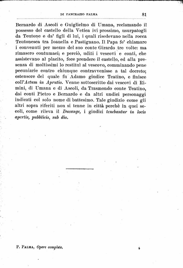 Bernardo di Ascoli e Guiglielmo di Umana, reclamando il possesso del castello della Vetica ivi prossimo, usurpatogli da Teutone e da' figli di lui, i quali risedevano nella rocca Teutonesca tra loanella e Pastignano. Il Papa fé' chiamare i convenuti per mezzo del suo conte Girardo tre volte: ma rimasero contumaci; e perciò, uditi i vescovi e conti, che assistevano al placito, fece prendere il castello, ed alla presenza di moltissimi lo restituì al vescovo, comminando pene pecuniarie contro chiunque contravvenisse a tal decreto; estensore del quale fu Adamo giudice Teatino, e finisce colVActum in Aprutio. Venne sottoscritto dai vescovi di Ei-mini, di Umana e di Ascoli, da Trasmondo conte Teatino, dai conti Pietro e Bernardo e da altri undici personaggi indicati col solo nome di battesimo. Tale giudizio come gli altri sopra riferiti non si tenne in città perché in quei secoli, come rileva il Ducange, i giudizi tenèbantur in locis apcrtis, pubblicis, sub dio.