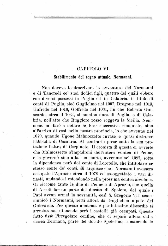 Non doveva io descrivere le avventure dei Normanni e di Tancredi co' suoi dodici figli, quattro dei quali ebbero con diversi possessi in Puglia ed in Calabria, il titolo di conti di Puglia, cioè Guglielmo nel 1007, Drogone nel 1013, Unfredo nel 1010, Goffredo nel 1031, fin che Eoberto Guiscardo, circa il 1034, si nominò duca di Puglia, e di Calabria, nell'atto che Ruggiero rosso reggeva la kSicilia. Nemmeno mi farò a notare le loro successive conquiste, sino all'arrivo di essi nella nostra provincia, lo che avvenne nel 1079, quando Ugone Malmozzetto invase e quasi distrasse l'abbadia di Casauria. Al contrario prese sotto la sua protezione l'altra di Carpinete. Il cronista di questa ci avverte che Malmozzetto s'impadronì dell'intera contea di Penne, e la governò sino alla sua morte, avvenuta nel 1097, sotto la dipendenza però del conte di Loretello, che intitolava se stesso conte de' conti. Si arguisce che i Normanni avessero occupato l'Apruzio circa il 1078 ed assoggettato i vari dinasti, andandosi estendendo nella prossima contea ascolana. Or siccome tanto le due di Penne e di Apruzio, che quella di Ascoli facean parte del ducato di Spoleto, del quale i Papi avean ormai la sovranità, così S. Gregorio VII scorn-municò i Normanni, retti allora da Guglielmo nipote del Guiscardo. Per questo anatema e per intestine discordie si arrestarono, ritenendo però i castelli già occupati. Questo fatto fissò l'irregolare confine, che ci separò allora dalla marca Eermana, parte del ducato Spoletino; rimanendo le