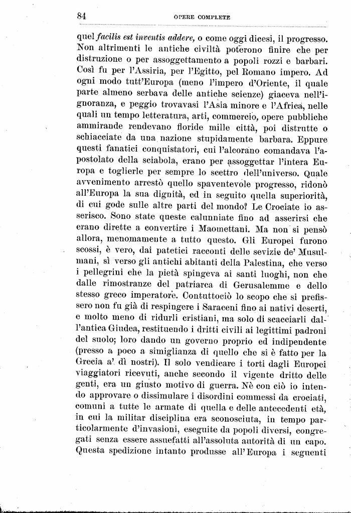 qiwlfacilis est inventis addere, o come oggi dicesi, il progresso. Non altrimenti le antiche civiltà poterono finire che per distruzione o per assoggettamento a popoli rozzi e barbari. Così fu per l'Assiria, per l'Egitto, pel Eomano impero. Ad ogni modo tutt'Europa (meno l'impero d'Oriente, il quale parte almeno serbava delle antiche scienze) giaceva nell'ignoranza, e peggio trovavasi l'Asia minore e l'Africa, nelle quali un tempo letteratura, arti, commercio, opere pubbliche ammirande rendevano floride mille città, poi distrutte o schiacciate da una nazione stupidamente barbara. Eppure questi fanatici conquistatori, cui l'alcorano comandava l'apostolato della sciabola, erano per assoggettar l'intera Europa e toglierle per sempre lo scettro dell'universo. Quale avvenimento arrestò quello spaventevole progresso, ridonò all'Europa la sua dignità, ed in seguito quella superiorità, di cui gode sulle altre parti del mondo? Le Crociate io asserisco. Sono state queste calunniate fino ad asserirsi che erano dirette a convertire i Maomettani. Ma non si pensò allora, menomamente a tutto questo. Gli Europei furono scossi, è vero, dai patetici racconti delle sevizie de' Musulmani, sì verso gli antichi abitanti della Palestina, che verso i pellegrini che la pietà spingeva ai santi luoghi, non che dalle rimostranze del patriarca di Gerusalemme e dello stesso greco imperatore. Contuttociò lo scopo che si prefissero non fu già di respingere i Saraceni fino ai nativi deserti, e molto meno di ridurli cristiani, ma solo di scacciarli dall'antica Giudea, restituendo i dritti civili ai legittimi padroni del suolo; loro dando un governo proprio ed indipendente (presso a poco a simiglianza di quello che si è fatto per la Grecia a' dì nostri). Il solo vendicare i torti dagli Europei viaggiatori ricevuti, anche secondo il vigente dritto delle genti, era un giusto motivo di guerra. Né con ciò io intendo approvare o dissimulare i disordini commessi da crociati, comuni a tutte le armate di quella e delle antecedenti età, in cui la militar disciplina era sconosciuta, in tempo particolarmente d'invasioni, eseguite da popoli diversi, congregati senza essere assuefatti all'assoluta autorità di un capo. Questa spedizione intanto produsse all'Europa i seguenti