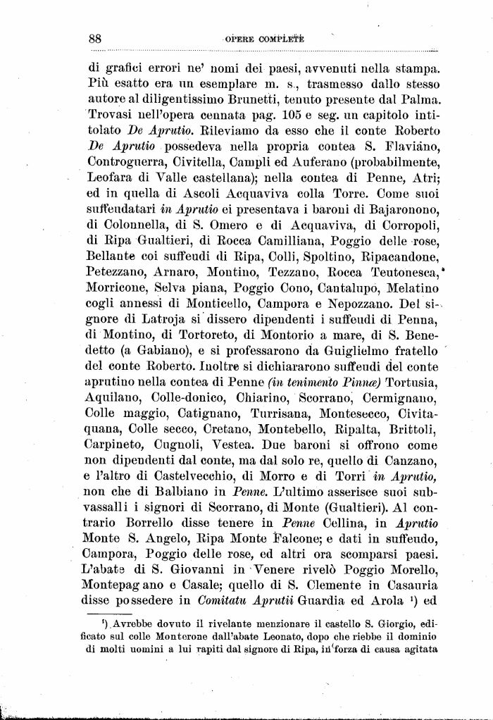 di grafici errori ne' nomi dei paesi, avvenuti nella stampa. Più esatto era un esemplare m. s., trasmesso dallo stesso autore al diligentissiuio Brunetti, tenuto presente dal Palma. Trovasi nell'opera cennata pag. 105 e seg. un capitolo intitolato De Aprutio. Eileviamo da esso che il conte Eoberto De Aprutio possedeva nella propria contea S. Flaviàno, Ooritroguerra, Civitella, Campii ed Auferano (probabilmente, Leofara di Valle castellana); nella contea di Penne, Atri; ed in quella di Ascoli Acquaviva colla Torre. Come suoi suffeudatari in Aprutio ei presentava i baroni di Bajaronono, di Colonnella, di S. Omero e di Acquaviva, di Corropoli, di Ripa Gualtieri, di Bocca Camilliaua, Poggio delle rose, Bollante coi suffeudi di Eipa, Colli, Spoltino, Eipacandone, Petezzano, Amaro, Montino, Tezzano, Eocca Teuto'nesca, * Morricone, Selva piana, Poggio Cono, Cantalupo, Melatino cogli annessi di Monticello, Campora e Nepozzano. Del signore di Latroja si dissero dipendenti i suffeudi di Penna, di Montino, di Tortoreto, di Montorio a mare, di S. Benedetto (a Gabiano), e si professarono da Guiglielmo fratello del conte Eoberto. Inoltre si dichiararono suffeudi del conte aprutino nella contea di Penne (in tenimento Pinna) Tortusia, Aquilano, Colle-donico, Ohiarino, Scorrano, Cermignano, Colle maggio, Catignano, Turrisana, Montesecco, Civita-quana, Colle secco, Cretano, Montebello, Eipalta, Brittoli, Carpinete, Cugnoli, Vestea. Due baroni si offrono come non dipendenti dal conte, ma dal solo re, quello di Ganzano, e l'altro di Castelvecchio, di Morrò e di Torri in Aprutio, non che di Balbiano in Penne. L'ultimo asserisce suoi subvassalli i signori di Scorrano, di Monte (Gualtieri). Al contrario Borrello disse tenere in Penne Cellina, in Aprutio Monte S. Angelo, Eipa Monte Falcone; e dati in suffeudo, Campora, Poggio delle rose, ed altri ora scomparsi paesi. L'abate di S. Giovanni in Venere rivelò Poggio Morello, Montepagano e Casale; quello di S. Clemente in Casauria disse possedere in Gomitatu Aprutii Guardia ed Arola ') ed