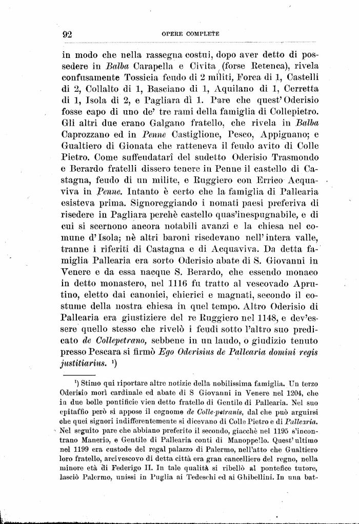 in modo che nella rassegna costui, dopo aver detto di possedere in Batta Oarapella e Ci vita (forse lìetenca), rivela confusamente Tossicia feudo di 2 militi, Forca di 1, Castelli di 2, Oollalto di 1, Basciano di 1, Aquilano di 1, Oerretta di 1, Isola di 2, e Pagliara di 1. Pare che quest' Oderisio fosse capo di uno de' tre rami della famiglia di Oollepietro. Gli altri due erano Galgano fratello, che rivela in Batta Oaprozzano ed in Penne Oastiglione, Pesco, Appigliano; e Gualtiero di Gionata che ratteneva il feudo avito di Colle Pietro. Coinè suflfeudatari del sudetto Oderisio Trasmondo e Berardo fratelli dissero tenere in Penne il castello di Castagna, feudo di un milite, e Ruggiero con Erpico- Acqua-viva in Penne. Intanto è certo che la famiglia di Pallearia esisteva prima. Signoreggiando i nomati paesi preferiva di risedere in Pagliara perché castello quas'inespugnabile, e di cui si scernono ancora notabili avanzi e la chiesa nel comune d'Isola; né altri baroni risedevano nell' intera valle, tranne i riferiti di Castagna e di Acquaviva. Da detta famiglia Pallearia era sorto Oderisio abate di S. Giovanni in Venere e da essa nacque S. Berardo, che essendo monaco in detto monastero, nel 1116 fu tratto al vescovado Apru-tino, eletto dai canonici, chierici e magnati, secondo il costume della nostra chiesa in quel tempo. Altro Oderisio di Pallearia era giustiziere del re lìuggiero nel 1148, e dev'essere quello stesso che rivelò i feudi sotto l'altro suo predicato de Collepetrano, sebbene in un laudo, o giudizio tenuto presso Pescara si firmò Ego Oderisius de Pallearia domini regis justitiariiis. ')
