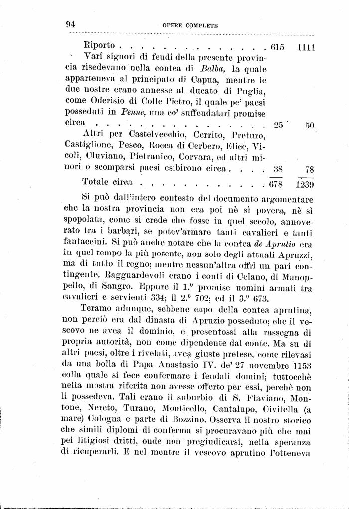 Si può dall'intero contesto del documento argomentare che la nostra provincia non era poi né sì povera, né sì spopolata, come si crede che fosse in quel secolo, annoverato tra i barbari, se potev'armare tanti cavalieri e tanti fantaccini. Si può anche notare che la contea de Aprutio era in quel tempo la più potente, non solo degli attuali Apruzzi, ma di tutto il regno; mentre nessun'altra offrì un pari contingente. Ragguardevoli erano i conti di Celano, di Manop-pello, di Sangro. Eppure il 1.. promise nomini armati tra cavalieri e servienti 334; il 2.. 702; ed il 3.° 073.
