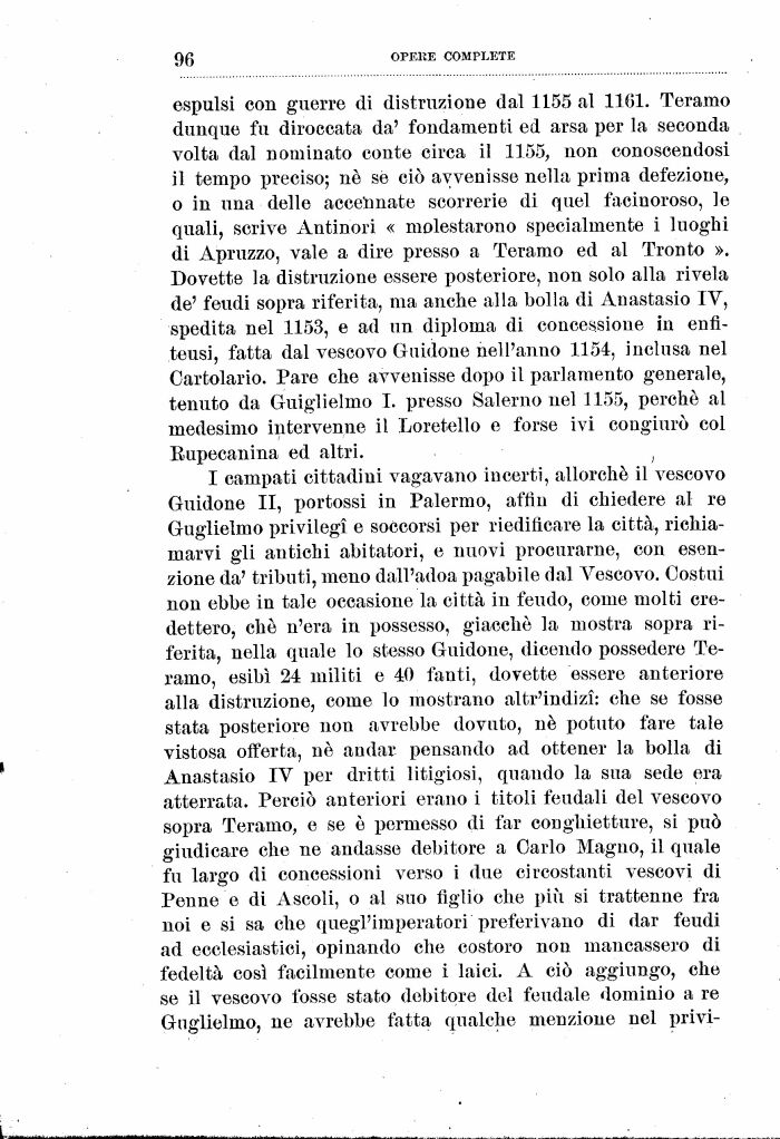 I campati cittadini vagavano incerti, allorché il vescovo Guidone II, pertossi in Palermo, affili di chiedere al re Guglielmo privilegi e soccorsi per riedificare la città, richiamarvi gli antichi abitatori, e nuovi procurarne, con esenzione da' tributi, meno dall'adoa pagabile dal Vescovo. Costui non ebbe in tale occasione la città in feudo, come molti credettero, che n'era in possesso, giacché la mostra sopra riferita, nella quale lo stesso Guidone, dicendo possedere Te-ramo, esibì 24 militi e 40 fanti, dovette essere anteriore alla distruzione, come lo mostrano altr'indizl: che se fosse stata posteriore non avrebbe dovuto, né potuto fare tale vistosa oiferta, né andar pensando ad ottener la bolla di Anastasio IV per dritti litigiosi, quando la sua sede era atterrata. Perciò anteriori erano i titoli feudali del vescovo sopra Teramo, e se è permesso di far conghietture, si può giudicare che ne andasse debitore a Carlo Magno, il quale fu largo di concessioni verso i due circostanti vescovi di Penne e di Ascoli, o al suo figlio che più si trattenne fra noi e si sa che quegl'imperatori preferivano di dar feudi ad ecclesiastici, opinando che costoro non mancassero di fedeltà così facilmente come i laici. A ciò aggiungo, che se il vescovo fosse stato debitore del feudale dominio a re Guglielmo, ne avrebbe fatta qualche menzione nel privi-