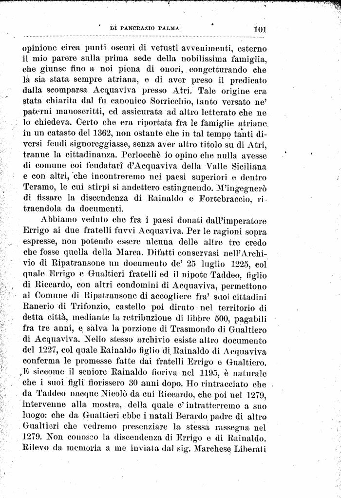 opinione circa punti oscuri di vetusti avvenimenti, esterno il mio parere sulla prima sede della nobilissima famiglia, che giunse fino a noi piena di onori, congetturando che là sia stata sempre atriana, e di aver preso il predicato dalla scomparsa Acqjiaviva presso Atri. Tale origine era stata chiarita dal fu canonico Sorricehio, lanto versato ne' paterni manoscritti, ed assicurata ad altro letterato che ne lo chiedeva. Certo che era riportata fra le famiglie atriane in un catasto del 1362, non ostante che in tal tempo tanti diversi feudi signoreggiasse, senza aver altro titolo su di Atri, tranne la cittadinanza. Perlocchè io opino che nulla avesse di comune coi feudatarì d'Acquaviva della Valle Siciliana e con altri, 'che incontreremo nei paesi superiori e dentro Teramo, le cui stirpi si andettero estinguendo. M'ingegnerò di fissare la discendenza di Eainaldo e Fortebraccio, ri-traendola da documenti.