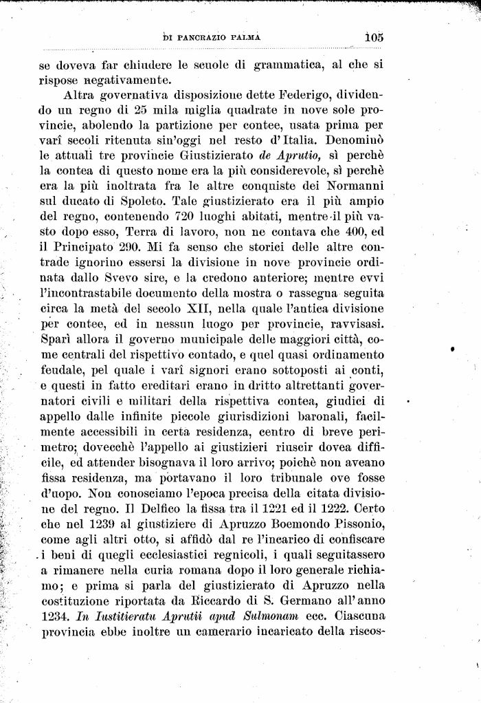 Altra governativa disposizione dette Federigo, dividendo un regno di 25 mila miglia quadrate in nove sole pro-vincie, abolendo la partizione per contee, usata prima per vari secoli ritenuta sin'oggi nel resto d'Italia. Denominò le attuali tre provinole Giustizierato de Aprutio, sì perché la contea di questo nome era la più considerevole, sì perché era la più inoltrata fra le altre conquiste dei Normanni sul ducato di Spoleto. Tale giustizierato era il più ampio del regno, contenendo 720 luoghi abitati, mentre -il più vasto dopo esso, Terra di lavoro, non ne contava che 400, ed il Principato 290. Mi fa senso che storici delle altre contrade ignorino essersi la divisione in nove provincie ordinata dallo Svevo sire, e la credono anteriore; mentre evvi l'incontrastabile documento della mostra o rassegna seguita circa la metà del secolo XII, nella quale l'antica divisione per contee, ed in nessun luogo per provincie, ravvisasi. Sparì allora il governo municipale delle maggiori città, come centrali del rispettivo contado, e quel quasi ordinamento feudale, pel quale i vari signori erano sottoposti ai conti, e questi in fatto eredi tari erano in dritto altrettanti governatori civili e militari della rispettiva contea, giudici di appello dalle infinite piccole giurisdizioni baronali, facilmente accessibili in certa residenza, centro di breve perimetro; dovecchè l'appello ai giustizieri riuscir dovea difficile, ed attender bisognava il loro arrivo; poiché non aveano fissa residenza, ma portavano il loro tribunale ove fosse d'uopo. Non conosciamo l'epoca precisa della citata divisione del regno. Il Delfico la fissa tra il 1221 ed il 1222. Certo che nel 1239 al giustiziere di Apruzzo Boemondo Pissonio, come agli altri otto, si affidò dal re l'incarico di confiscare . i beni di quegli ecclesiastici regnicoli, i quali seguitassero a rimanere nella curia romana dopo il loro generale richiamo; e prima si parla del giustizierato di Apruzzo nella costituzione riportata da lìiccardo di S. Germano all'anno 1234. In Itistitieratu Aprutii apnd Siilmonam ecc. Ciascuna provincia ebbe inoltre un camerario incaricato della riscos-