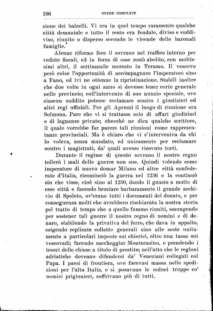 Durante il regime di questo sovrano il nostro regno tollerò i mali delle guerre non sue. Quindi volendo come imperatore di nuovo domar Milano ed altre città confederate d'Italia> ricominciò la guerra nel 1236 e la continuò sin che visse, cioè sino al 1250, dando il guasto a molte di esse città e facendo bruciare barbaramente il grande archivio di Spoleto, ov'erano tutti i documenti del ducato, e per conseguenza molti che avrebbero rischiarata la nostra storia pel tratto di tempo che a quello fummo riuniti, smungendo per sostener tali guerre il nostro regno di uomini e di denaro, stabilendo la privativa del ferror che dava in appalto, esigendo replicate collette generali sino alle seste unitamente a particolari imposte sui chierici, oltre una tassa sui vescovadi; facendo saccheggiar Montecasino, e prendendo i tesori delle chiese a titolo di prestito; nell'atto che le regioni adriatiche doveano difendersi da' Veneziani collegati col Papa. I paesi di frontiera, ove facevasi massa nelle spedizioni per l'alta Italia, e si posavano le reduci truppe co' nemici prigionieri, soffrivano più di tutti.