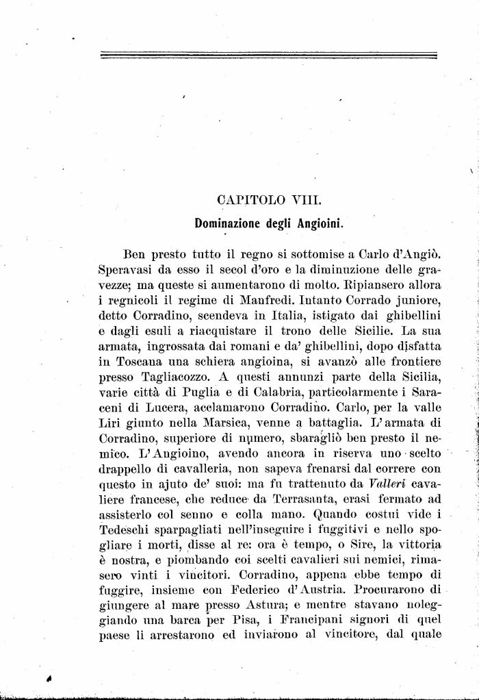 Ben presto tutto il regno si sottomise a Carlo d'Angiò. Speravasi da esso il secol d'oro e la diminuzione delle gravezze; ma queste si aumentarono di molto. Kipiansero allora i regnicoli il regime di Manfredi. Intanto Corrado juniore, detto Corradino, scendeva in Italia, istigato dai ghibellini e dagli esuli a riacquistare il trono delle Sicilie. La sua armata, ingrossata dai romani e da' ghibellini, dopo disfatta in Toscana una schiera angioina, si avanzò alle frontiere presso Tagliacozzo. A questi annunzi parte della Sicilia, varie città di Puglia e di Calabria, particolarmente i Saraceni di Lucera, acclamarono Corradino. Carlo, per la valle Liri giunto nella Marsica, venne a battaglia. L'armata di Corradino, superiore di numero, sbaragliò ben presto il nemico. L'Angioino, avendo ancora in riserva uno scelto drappello di cavalleria, non sapeva frenarsi dal correre con questo in ajuto de' suoi: ina fu trattenuto da Talleri cavaliere francese, che reduce da Terrasanta, erasi fermato ad assisterlo col senno e colla mano. Quando costui vide i Tedeschi sparpagliati nell'inseguire i fuggitivi e nello spogliare i morti, disse al re: ora è tempo, o Sire, la vittoria è nostra, e jìiombando coi scelti cavalieri sui nemici, rimasero vinti i vincitori. Corradiuo, appena ebbe tempo di fuggire, insieme con Federico d'Austria. Procurarono di giungere al mare presso Astura; e mentre stavano noleggiando una barca per Pisa, i Francipani signori di quel paese li arrestarono ed inviarono al vincitore, dal quale