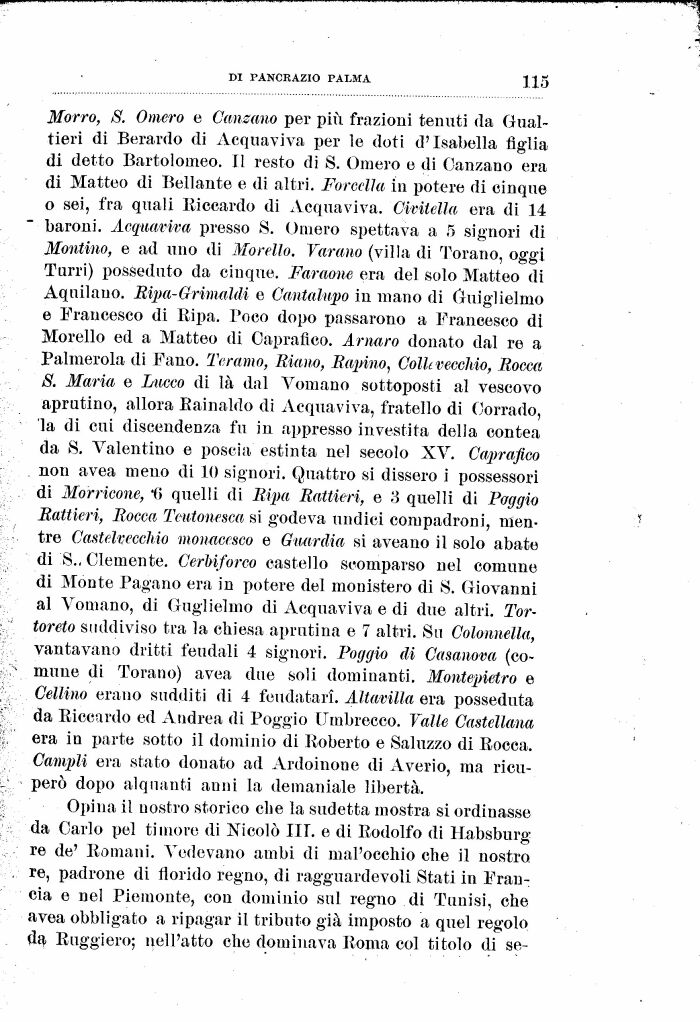 ' baroni. Acquaviva presso S. Omero spettava a 5 signori di Montino, e ad uno di Morello. Varano (villa di Torano, oggi Turri) posseduto da cinque. Faraone era del solo Matteo di Aquilauo. Ripa-Grimaldi e Cantalupo in mano di Guiglielmo e Francesco di Eipa. Poco dopo passarono a Francesco dì Morello ed a Matteo di Capranco. Amaro donato dal re a Palmerola di Fano. Te ramo, Eiaìw, Rapino, Colltvecchio, Rocca 8. Maria e Lucco di là dal Vomano sottoposti al vescovo aprutino, allora Eainaldo di Acquaviva, fratello di Corrado, 'la di cui discendenza fu in appresso investita della contea da S. Talentino e poscia estinta nel secolo XV. Caprafico