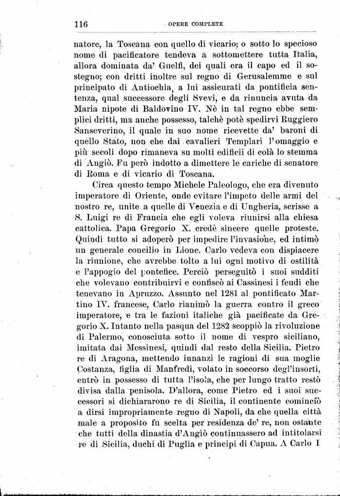 Circa questo tempo Michele Paleologo, che era divenuto imperatore di Oriente, onde evitare l'impeto delle armi del nostro re, unite a quelle di Venezia e di Ungheria, scrisse a S. Luigi re di Francia che egli voleva riunirsi alla chiesa cattolica. Papa Gregorio X. credè sincere quelle proteste. Quindi tutto si adoperò per impedire l'invasione, ed intimò un generale concilio in Lione. Carlo vedeva con dispiacere la riunione, che avrebbe tolto a lui ogni motivo di ostilità e l'appogio del pontefice. Perciò perseguitò i suoi sudditi che volevano contribuirvi e confiscò ai Cassinesi i feudi che tenevano in Apruzzo. Assunto nel 1281 al pontificato Martino IV. francese, Carlo rianimò la guerra contro il greco imperatore, e tra le fazioni italiche già pacificate da Gregorio X. Intanto nella pasqua del 1282 scoppiò la rivoluzione di Palermo, conosciuta sotto il nome di vespro siciliano, imitata dai Messinesi, quindi dal resto della Sicilia. Pietro re di Aragona, mettendo innanzi le ragioni di sua moglie Costanza, figlia di Manfredi, volato in soccorso degl'insorti, entrò in possesso di tutta l'isola, che per lungo tratto restò divisa dalla penisola. D'allora, come Pietro ed i suoi successori si dichiararono re di Sicilia, il continente cominciò a dirsi impropriamente regno di Napoli, da che quella città male a proposito fu scelta per residenza de' re, non ostante che tutti della dinastia d'Angiò continuassero ad intitolarsi re di Sicilia, duchi di Puglia e principi di Capua. A Carlo I