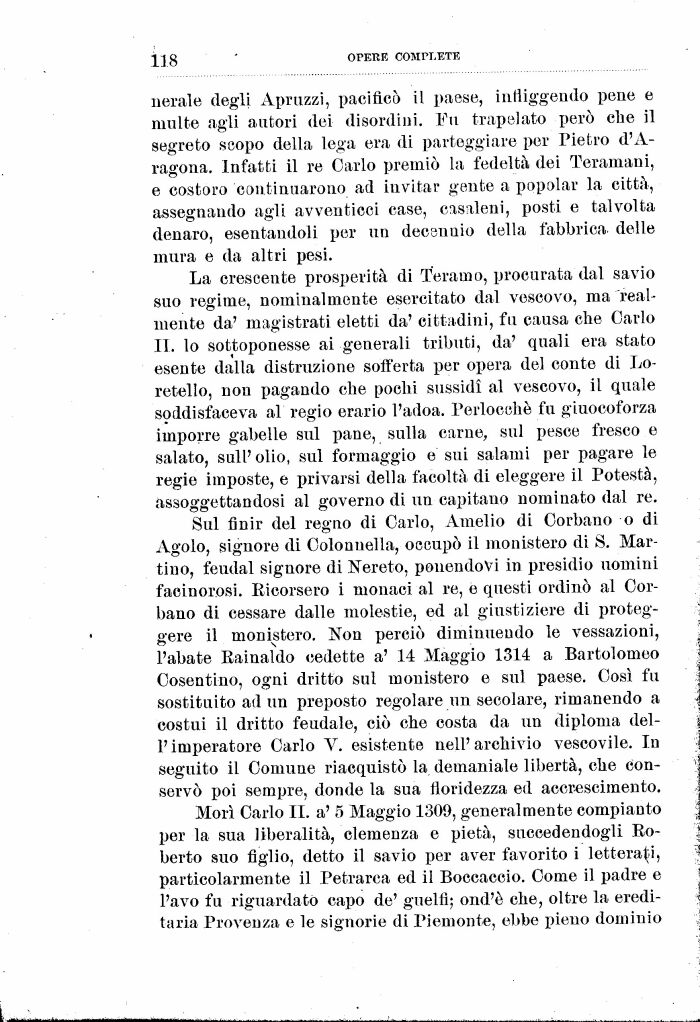 nerale degli Apruzzi, pacificò il paese, infliggendo pene e multe agli autori dei disordini. Fu trapelato però che il segreto scopo della lega era di patteggiare per Pietro d'A-ragona. Infatti il re Carlo premiò la fedeltà dei Teramani, e costoro continuarono ad invitar gente a popolar la città, assegnando agli avventicci case, casaleni, posti e talvolta denaro, esentandoli per un decennio della fabbrica delle mura e da altri pesi.
