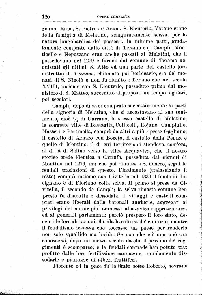 Campii, dopo di aver comprato successivamente le parti della signoria di Melatine, che si accostavano al suo teni-mento, cioè 3/4. di Garrano, lo stesso castello di Melatine, le soggette ville di Battaglia, Celiiceli!, Eojano, Canapiglie, Masseri e Pastinella, comprò da altri a più riprese Gagliano, il castello di Amaro con Boceto, il castello della Penna e quello di Montino, il di cui territorio si stendeva, com'ora, al di là di Salino verso la villa Acquaviva, che il nostro storico crede identica a Carrufo, posseduta dai signori di Montino nel 1279, ma che poi riunita a S. Omero, seguì le feudali traslazioni di questo. Finalmente (tralasciando il resto) comprò insieme con Civitella nel 1330 il feudo di Li-cignano e di Floriano colla selva. Il primo si prese da Civitella, il secondo da Campii; la selva rimasta comune ben presto fu distrutta e dissodata. I villaggi e castelli comprati erano liberati dalle baronali angherie, aggregati ai privilegi del municipio, ammessi alla «ivica rappresentanza ed ai generali parlamenti: perciò prospero il loro stato, decenti le loro abi tazioni, florida la coltura de' contorni, mentre il feudalismo bastava che toccasse un paese per renderlo non solo squallido ma lurido. Se non che ciò non può ora conoscersi, dopo un mezzo secolo da che il pessimo de' reggimenti è scomparso; e le feudali contrade han potuto trai; profitto dalle loro fertilissime campagne, rapidamente dissodarle e piantarle di alberi fruttiferi.