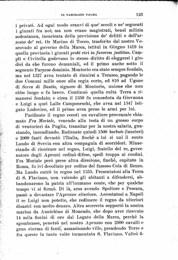 i privati. Ad ogni modo eranvi di que' secoli e ne' seguenti i giurati fra noi; ma non erano magistrati, bensì milizia sedentauea, incaricata della previsione de' delitti e dell'arresto'de' rei. Or Marino di Tocco, trasferito dal nostro Vescovado al governo della Marca, istituì in Giugno 1419 in quella provincia i giurati probi viri in favórem justitiae. Campii e Oivitella godevano lo stesso diritto di eleggersi i giudici da che furono demaniali, ed il primo anche sotto il seguente Farnese dominio. Montorio era stato sempre feudale, ma nel 1327 avea tentato di riunirsi a Teramo, pagando le due Comuni mille once alla regia corte, ed 810 ad Ugone di Serra di Bantio, signore di Montorio, unione che non ebbe luogo o fu breve. Continuò quella culta Terra a rimanersi feudale; e circa il 1350 fu conceduta da Giovanna e Luigi a quel Lalle Camponeschi, che avea nel 1347 istigato Ludovico, ed il primo avea preso le armi per lui.