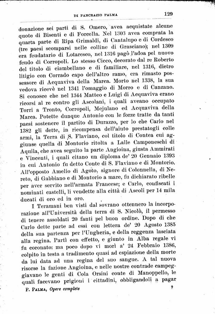 donazione sei parti di 8. Omero, avea acquistate alcune quote di Bisenti e di Forcella. Nel 1303 avea comprata la quarta parte di Ripa Grimaldi, di Cantalupo e di Oordesco (tre paesi scomparsi nelle colline di Grasciano); nel 1309 era feudatario di Lotareseo, nel 1316 pagò l'adoa pel nuovo feudo di Oorropoli. Lo stesso Cicco, decorato dal re Eoberto del titolo di ciambellano e di familiare, nel 1316, dietro litigio con Corrado capo dell'altro ramo, era rimasto possessore di Acqua viva della Marca. Morto nel 1338, la sua vedova ricevè nel 1341 l'omaggio di Morrò e di Ganzano. Si conosce che nel 1344 Matteo e Luigi di Acquaviva erano ricorsi al re contro gli Ascolani, i quali aveano occupato Torri a Tronto, Corropoli, Mejulano ed Acquaviva della Marca. Potette dunque Antonio con le forze tratte da tanti paesi sostenere il partito di Durazzo, per lo che Carlo nel 1382 gli dette, in ricompensa dell'aiuto prestatogli colle armi, la Terra di ,8. Flaviano, col titolo di Contea cui aggiunse quella di Montorio ritolta a Lalle Caniponeschi di Aquila, che avea seguito la parte Angioina, giusta Ammirati e Vincenti, i quali citano un diploma de' 20 Gennaio 1393 in cui Antonio fu detto Conte di S. Flaviauo e di Montorio, All'opposto Amelie di Agoto, signore di Colonnella, di Ne-reto, di Gabbiano e di Montorio a mare, fu dichiarato ribelle per aver servito nell'armata Francese; e Carlo, confiscati i nominati castelli, li vendette alla città di Ascoli per 14 mila ducati di oro ed in oro.