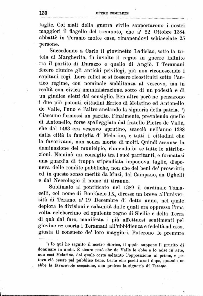 ') Io qui ho seguito il nostro Storico, il quale suppone il prurito di dominare in ambi. È sicuro però che de Valle lo ebbe e lo mise in atto, non così Melatino, del quale costa soltanto l'opposizione al primo, e poteva ciò essere pel pubblico bene. Certo che pochi anni dopo, quando ne * favorevole occasione, non pretese la signoria di Teramo,