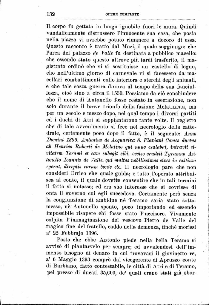 II corpo fu gettato in luogo ignobile fuori le mura. Quindi vandalicamente distrassero l'innocente sua casa, che posta nella piazza vi avrebbe potuto rimanere a decoro di essa. Questo racconto è tratto dal Muzi, il quale soggiunge: che l'area del palazzo de Valle fu destinata a pubblico macello: che essendo stato questo altrove più tardi trasferito, il magistrato ordinò che vi si sostituisse un castello di legno, che nell'ultimo giorno di carnevale vi si facessero da macellari combattimenti colle interiora e sterchi degli animali, e che tale sozza guerra durava al tempo della sua fanciullezza, cioè sino a circa il 1550. Possiamo da ciò con chiudere che il nome di Antonello fosse restato in esecrazione, non solo durante il breve trionfo della fazione Melatinista, ma per un secolo e mezzo dopo, nel qual tempo i diversi partiti ed i duchi di Atri si soppiantarono tante volte. Il registro che di tale avvenimento si fece nel necrologio della cattedrale, certamente poco dopo il fatto, è il seguente: Anno Domini 1390. Antonina de Acquaviva 8. Flaviani Comes ductus ab Henrico Buberti de Melatino qui nunc esulabat, intravit ci-vitatem Terami et eam subegit sibi, occiso crudeli Tyramno Antonello loannis de Valle, qui multos nóbilissimos cives in exitium egerat, direptis eorum bonis etc. Il necrologio pare che non consideri Braco che quale guida; e tutto l'operato attribuisca al conte, il quale dovette consentire che in tali termini il fatto si notasse; ed era suo interesse che si covrisse di onta il governo cui egli succedeva. Certamente però senza la congiunzione di ambidue né Teramo saria stato sottomesso, né Antonello spento, poco importando ed essendo impossibile risapere chi fosse stato l'uccisore. Vivamente colpita l'immaginazione del vescovo Pietro de Valle del tragico fine del fratello, cadde nella demenza, finche morissi a' 22 Febbrajo 1396.