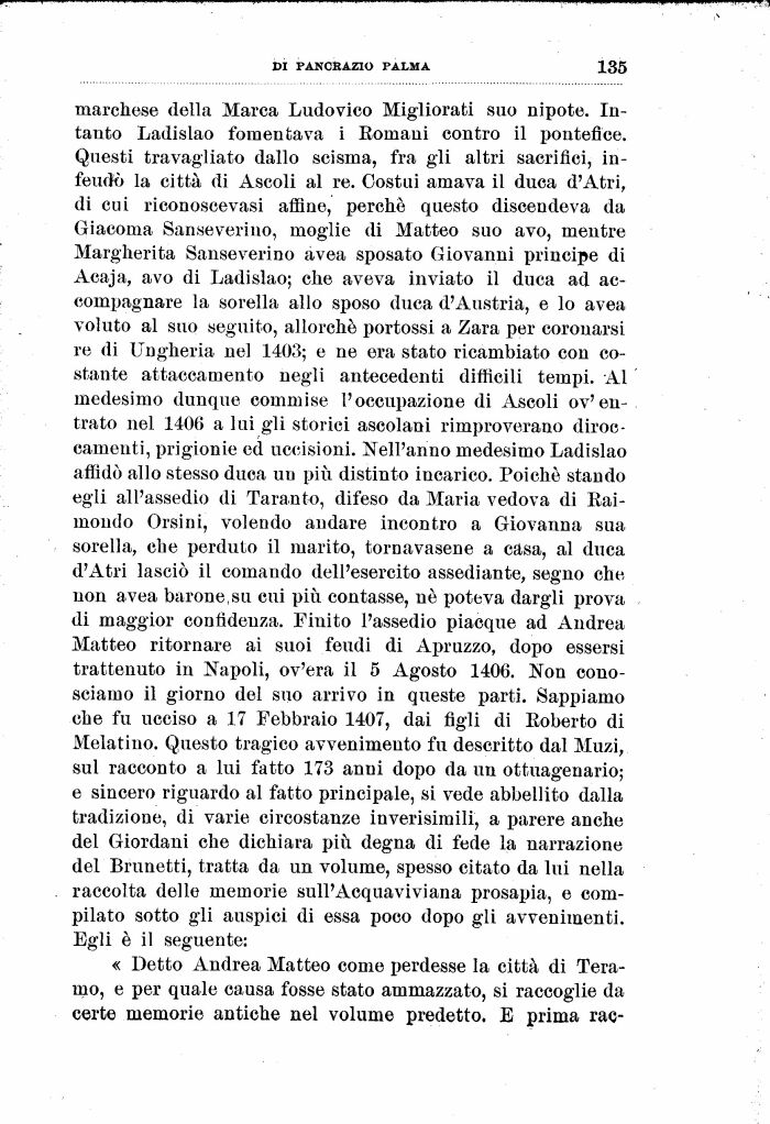 marchese della Marca Ludovico Migliorati suo nipote. Intanto Ladislao fomentava i Romani contro il pontefice. Questi travagliato dallo scisma, fra gli altri sacrifici, infeudò la città di Ascoli al re. Costui amava il duca d'Atri, di cui riconoscevasi affine, perche questo discendeva da Giacoma Sanseveriuo, moglie di Matteo suo avo, mentre Margherita Sanseverino àvea sposato Giovanni principe di Acaja, avo di Ladislao; che aveva inviato il duca ad accompagnare la sorella allo sposo duca d'Austria, e lo avea voluto al suo seguito, allorché pertossi a Zara per coronarsi re di Ungheria nel 1403; e ne era stato ricambiato con costante attaccamento negli antecedenti difficili tempi. Al medesimo dunque commise l'occupazione di Ascoli ov'entrato nel 1406 a lui gli storici ascolani rimproverano diroccamenti, prigionie ed uccisioni. Nell'anno medesimo Ladislao affidò allo stesso duca un più distinto incarico. Poiché stando egli all'assedio di Tarante, difeso da Maria vedova di Eai-moudo Orsini, volendo andare incontro a Giovanna sua sorella, che perduto il marito, tornavasene a casa, al duca d'Atri lasciò il comando dell'esercito assediante, segno che non avea barone,su cui più contasse, né poteva dargli prova di maggior confidenza. Finito l'assedio piacque ad Audrea Matteo ritornare ai suoi feudi di Apruzzo, dopo essersi trattenuto in Napoli, ov'era il 5 Agosto 1406. Non conosciamo il giorno del suo arrivo in queste parti. Sappiamo che fu ucciso a 17 Febbraio 1407, dai figli di Eoberto di Melatine. Questo tragico avvenimento fu descritto dal Muzi, sul racconto a lui fatto 173 anni dopo da un ottuagenario; e sincero riguardo al fatto principale, si vede abbellito dalla tradizione, di varie circostanze inverisimili, a parere anche del Giordani che dichiara più degna di fede la narrazione del Brunetti, tratta da un volume, spesso citato da lui nella raccolta delle memorie sull'Acquaviviana prosapia, e compilato sotto gli auspici di essa poco dopo gli avvenimenti. Egli è il seguente: