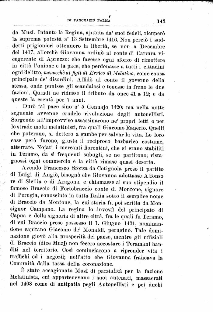 da Muzì. Intanto la Regina, ajutata da' suoi fedeli, ricuperò la suprema potestà a' 13 Settembre 1416. Non perciò i suddetti prigionieri ottennero la libertà, se non a Decernbre del 14lt, allorché Giovanna ordinò al conte di Carrara vicegerente di Aprnzzo: che facesse ogni sforzo di rimettere in città l'unione e la pace; che perdonasse a tutti i cittadini ogni delitto, menocchè ai figli di Errico di Melati™, come causa principale de' disordini. Affidò al conte il governo della stessa, onde punisse gli scandalosi e tenesse in freno le due fazioni. Quindi ne ridusse il tributo da once 41 a 12; e da queste la esentò per 7 anni.