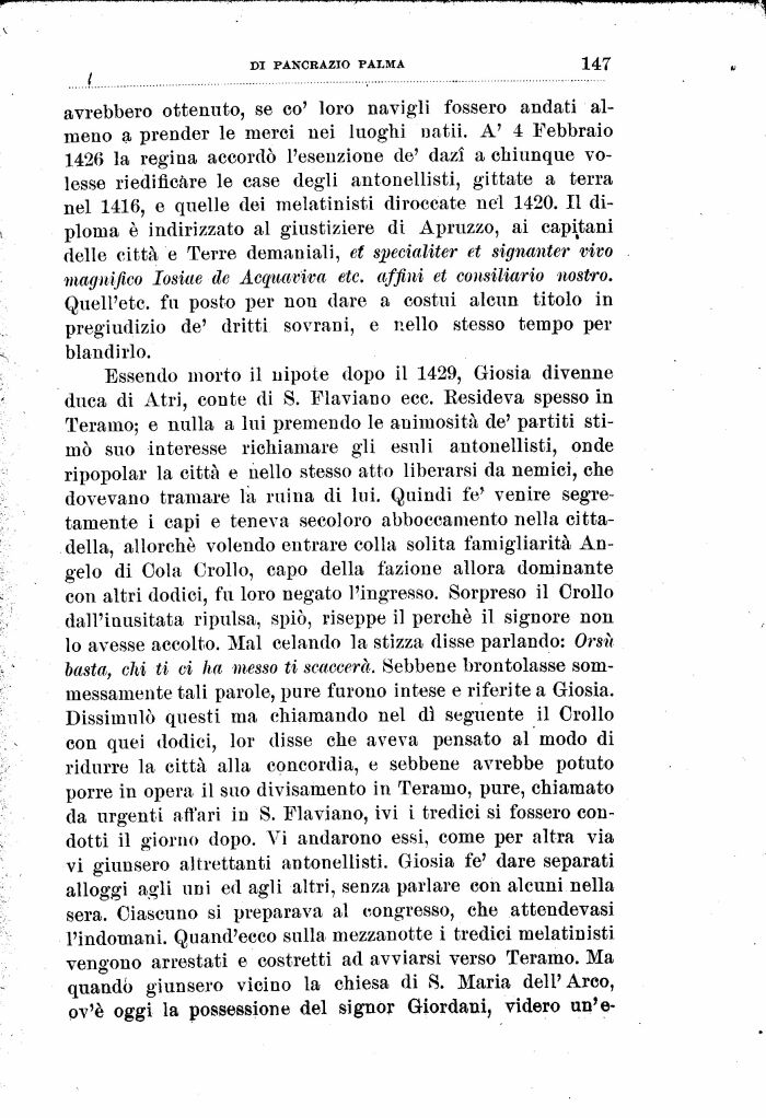 avrebbero ottenuto, se co' loro navigli fossero andati almeno a prender le merci nei luoghi natii. A' 4 Febbraio 1426 la regina accordò l'esenzione de' dazi a chiunque volesse riedificare le case degli antonellisti, gittate a terra nel 1416, e quelle dei melatinisti diroccate nel 1420. Il diploma è indirizzato al giustiziere di Apruzzo, ai capitani delle città e Terre demaniali, et specialiter et signanter vivo magnifico losiue de Acquaviva etc. affini et consiliario nostro. Quell'etc. fu posto per non dare a costui alcun titolo in pregiudizio de' dritti sovrani, e nello stesso tempo per blandirlo.