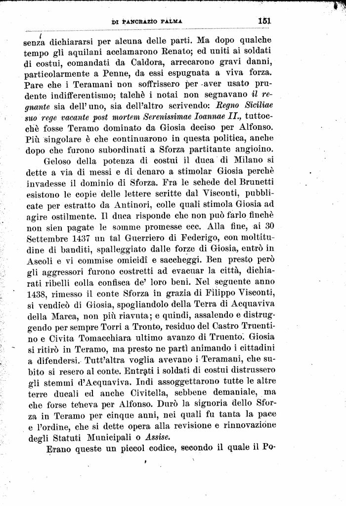 senza dichiararsi per alcuna delle partì. Ma dopo qualche tempo gli aquilani acclamarono Eenato; ed uniti ai soldati di costui, comandati da Caldora, arrecarono gravi danni, particolarmente a Penne, da essi espugnata a viva forza. Pare che i Teramani non soffrissero per -aver usato prudente indifferentismo; talché i notai non segnavano il regnante sia dell' uno, sia dell'altro scrivendo: Regno Siciliae suo rege vacante post mortem Serenissimae loannae IL, tuttoc-chè fosse Teramo dominato da Giosia deciso per Alfonso. Più singolare è che continuarono in questa politica, anche dopo che furono subordinati a Sforza partitante angioino.