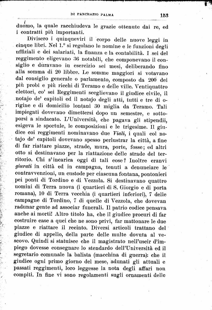 Divisero i quinqueviri il corpo delle nuove leggi in cinque libri. Nel 1.° si regolano le nomine e le funzioni degli ufflziali e dei salariati, la finanza e la contabilità. I sei del reggimento eligevano 36 notabili, che componevano il consiglio e duravano in esercizio sei mesi, deliberando fino alla somma di 20 libbre. Le somme maggiori si votavano dal consiglio generale o parlamento, composto da 200 dei più probi e più ricchi di Teramo e delle ville. Ventiquattro elettori, co' sei Eeggimenti sceglievano il giudice civile, il notajo de' capitoli ed il notajo degli atti, tutti e tre di o-rigine e di domiciliò lontani 30 miglia da Teramo. Tali impiegati dovevano dimettersi dopo un semestre, e sottoporsi a sindacato. L'Università, che pagava gli stipendii, esigeva le sportule, le composizioni e le trigesime. Il giudice coi reggimenti nominavano due Viali, i quali col notajo de' capitoli dovevano spesso perlustrar la città, a fine di far riattare piazze, strade, mura, porte, fosse; ed altri otto si destinavano per la riattazione delle strade del territorio. Ohi s'incarica oggi di tali cose? Inoltre eranvi giurati in città ed in campagna, tenuti a denunciare le contravvenzioni, un custode per ciascuna fontana, pontonieri pei ponti di Tordino e di Vezzola. Si destinavano quattro uomini di Terra nuova (i quartieri di 8. Giorgio e di porta romana), 10 di Terra vecchia (i quartieri inferiori), 7 delle campagne di Tordino, 7 di quelle di Vezzola, che dovevan radunar gente ad associar funerali. Il patrio codice pensava anche ai morti! Altro titolo ha, che il giudice procuri di far costruire case a quei che ne sono privi, far mattonare le due piazze e riattare il recinto. Diversi articoli trattano del giudice di appello, della parte delle multe dovuta al vescovo. Quindi si statuisce che il magistrato nell'uscir d'impiego dovesse consegnare lo stendardo dell'Università ed il segretario comunale la balista (macchina di guerra): che il giudice ogni primo giorno del mese, adunati gli attuali e passati reggimenti, loro leggesse la nota degli affari non compiti. In fine vi sono regolamenti sugli ornamenti delle